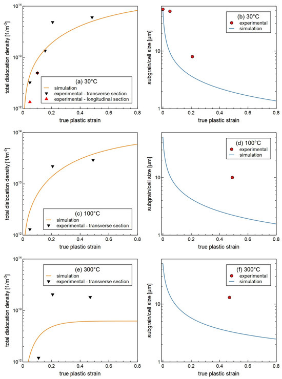 Simulated total dislocation density compared with experimental values from EBSD for deformed samples with strain rate of 0.1 s−1 at (a) 30 °C, (c) 100 °C and (e) 300 °C and subgrain/cell size changes during deformation at (b) 30 °C, (d) 100 °C and (f) 300 °C.