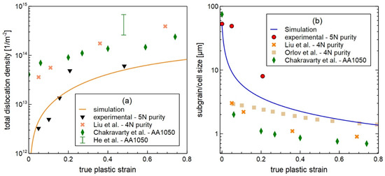 The findings of this study are broadly consistent with previously reported values in the literature, as shown in Figure 13. Studies by Orlov et al. [28], Liu et al. [72], Chakravarty et al. [73], and He et al. [39] investigated aluminum with lower purity (4N or AA1050) and reported higher dislocation densities. The comparatively lower values observed here are discussed in more detail in Section 4.