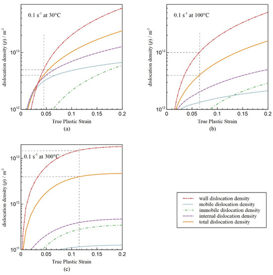 The evolution of dislocation densities for the samples which are deformed with strain rate of 0.1 s−1 at temperatures of 30, 100 and 300 °C is illustrated in Figure 7. For comparison between the simulation results for different equations of wall volume fraction, their evolutions are shown next to each other in the figure.