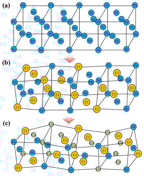 In MEAs, the incorporation of multiple principal elements results in a complex mixture of solute and solvent atoms within the alloy matrix. The integration of elements with varying atomic radii and shear moduli into a single lattice induces severe lattice distortion, which substantially impedes dislocation motion compared to pure metals or conventional alloys [14,15]. This phenomenon markedly enhances the mechanical strength of MEAs. As illustrated in Figure 1, the crystal structure of pure nickel (Ni) exhibits a highly ordered FCC arrangement (Figure 1a). Incorporating chromium (Cr), with a distinct atomic radius, introduces moderate lattice distortion in Ni–Cr binary alloys (Figure 1b). This distortion intensifies in ternary Co(1-x-y)CryNix MEAs (Figure 1c), where constituent atoms occupy lattice sites randomly with equal probability, forming a homogeneous solid solution. The increasing degree of lattice distortion with higher elemental diversity plays a critical role in enhancing the mechanical properties of MEAs.