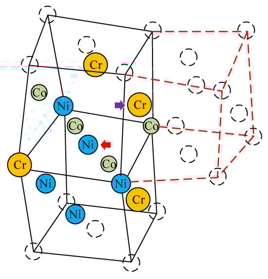 In the study of yield strength in MEAs, the effects of lattice distortion and modulus distortion on dislocation motion are critical factors. The solid-solution strengthening in concentrated alloys arises from random solute–pair interactions, which generate dislocation pinning forces governed by atomic size and shear modulus differences. Specifically, when dislocations are positioned within atomic clusters centered on a particular i-atom, their motion is governed by interactions between clusters centered on different atoms. For instance, as depicted in Figure 2, when a dislocation resides within a Ni-centered cluster (highlighted by red arrows), resistance to its motion arises from two sources: interactions within the Ni-centered cluster itself and interactions with a j-atom-centered cluster (e.g., those centered on Co or Cr, indicated by purple arrows). These interactions give rise to various atomic pairs, such as Ni-Co, Ni-Cr and Co-Cr, which induce severe lattice distortion, thereby influencing dislocation dynamics and contributing to the alloy’s strengthening. The resistance to dislocation motion varies depending on the interactions between atomic pairs within clusters centered on different atoms. According to classical dislocation theory, dislocations preferentially move along paths of least resistance, adhering to the principle of least resistance, which aligns with the principle of the minimum energy path for dislocation motion proposed by Ma et al. [34,35]. In MEAs, severe lattice and modulus distortions significantly disrupt the alloy’s slip systems, thereby impeding dislocation motion [3]. These distortions arise from interactions between atomic clusters, which collectively enhance the alloy’s mechanical strength by hindering dislocation glide.