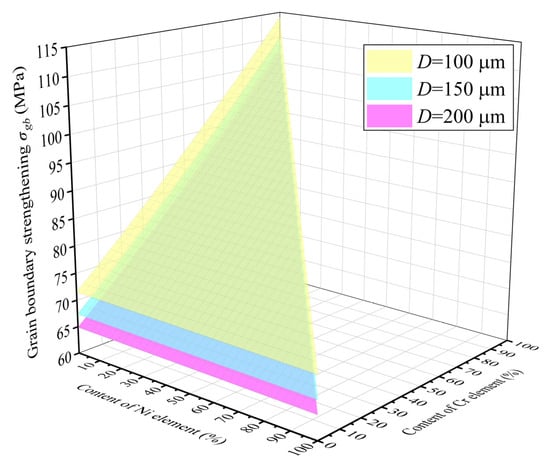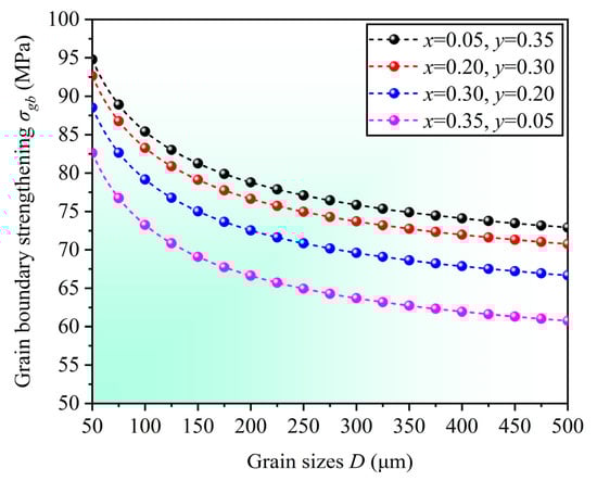 In the analysis of grain boundary strengthening in Co(1-x-y)CryNix MEAs, according to the above analysis and combined with Equations (2)–(5), the specified parameters [36], [10], and have been chosen for calculation. As depicted in Figure 3, variations in grain size (D = 100, 200, 300 µm) reveal that an increase in the Cr atomic fraction (y) significantly enhances grain boundary strengthening () in Co(1-x-y)CryNix MEAs. In contrast, the influence of the Ni atomic fraction (x) on is minimal and can be considered negligible. Additionally, Figure 4 across four distinct elemental composition groups, grain boundary strengthening () consistently decreases with increasing grain size from 50 to 500 . The results from Figure 3 and Figure 4 reveal the predominant influence of grain size and chemical composition on grain boundary strengthening. Table 1 indicates that the shear modulus () of Cr is significantly higher than that of Co () and Ni (). Consequently, increasing the Cr atomic fraction (y) markedly elevates the alloy’s overall shear modulus, which in turn enhances both the Peierls stress () and grain boundary strengthening (), as governed by Equation (2). These results underscore the critical influence of Cr content on the mechanical properties of Co(1-x-y)CryNix MEAs.