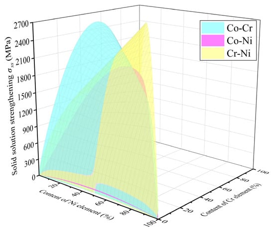 Dependence of solid solution strengthening () on atomic content of constituent elements in Co(1-x-y)CryNix MEAs with different atom pairs.