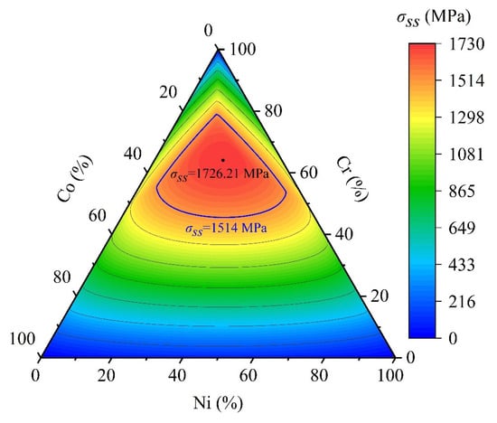 The solid solution strengthening of Co(1-x-y)CryNix MEAs is calculated using the model described in Equation (6), with the parameter () according to established theoretical frameworks [28,29]. This strengthening arises from the resistance to dislocation motion induced by interactions between pairs of randomly distributed solute atoms. As shown in Figure 5, varies with the atomic fractions x (Ni) and y (Cr), yielding three distinct strengthening contributions corresponding to the Co–Cr, Co–Ni, and Cr–Ni atomic pairs. Each value reflects the local lattice distortion and elastic mismatch associated with a specific solute pair within the FCC lattice. In accordance with the principle of least resistance, dislocation motion proceeds along the path of least resistance. Therefore, for any given composition (x, y), the effective solid solution strengthening is determined by the minimum among the three pair interactions. To elucidate the compositional dependence of this effective strengthening, Figure 6 presents a simplified two-dimensional contour representation derived from the three-dimensional surface in Figure 5. The color gradient spans from blue (0 MPa) to red (1726.21 MPa), illustrating the nonlinear variation of across the compositional space. The blue contour line demarcates a threshold of 1514 MPa, with of all compositions within the enclosed region exceeding this value. The maximum solid solution strengthening of 1726.21 MPa is achieved at the composition Co17Cr64Ni19 (marked by the black point), highlighting the pivotal role of high Cr content in enhancing lattice distortion and dislocation pinning. These results underscore the importance of precise compositional control in optimizing solid solution strengthening in Co(1-x-y)CryNix MEAs, providing a robust theoretical foundation for tailoring high-performance multi-principal element alloys.
