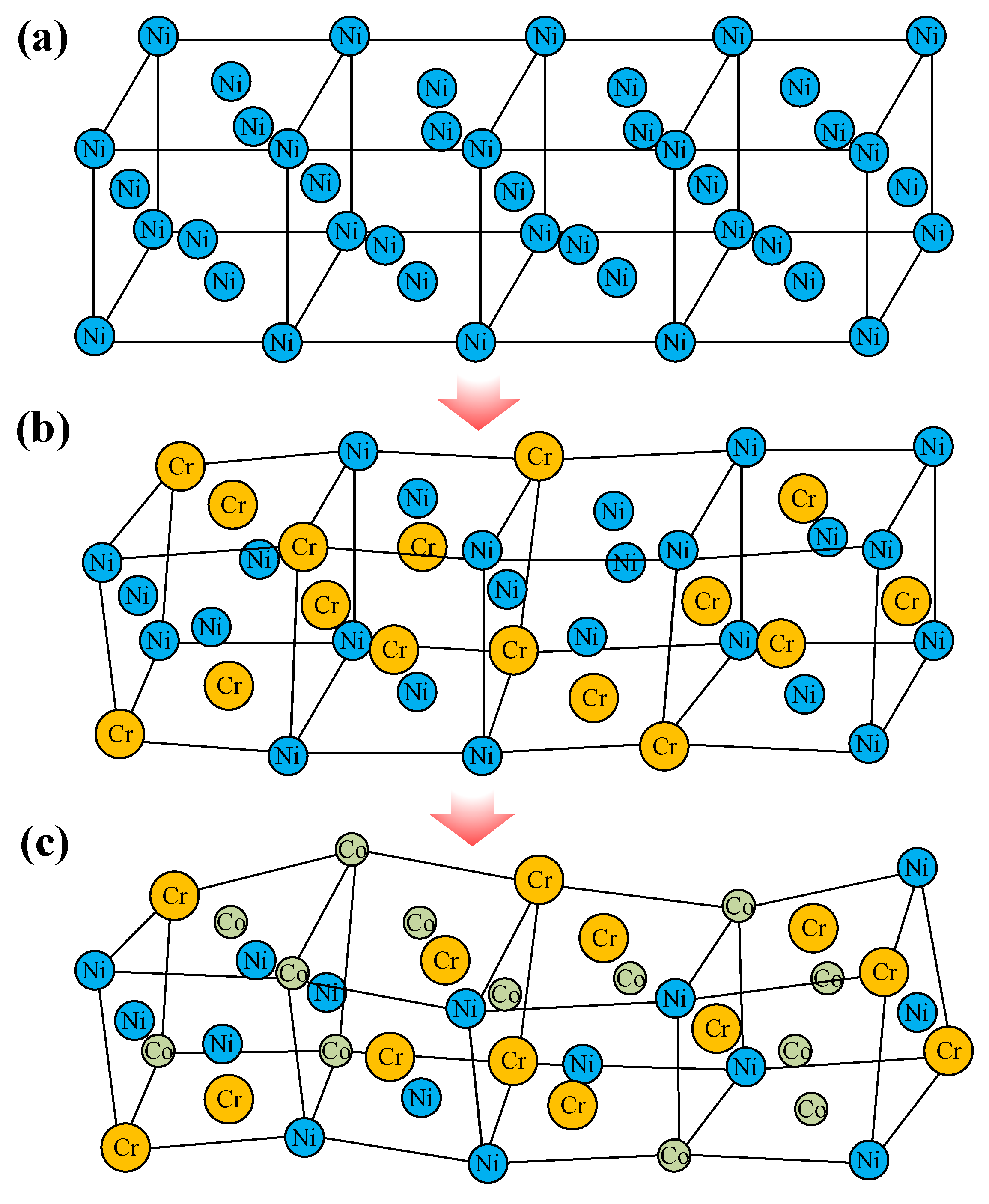 - Wang, H.; He, Q.F.; Gao, X.; Shang, Y.H.; Zhu, W.Q.; Zhao, W.J.; Chen, Z.Q.; Gong, H.; Yang, Y. Multifunctional high entropy alloys enabled by severe lattice distortion. Adv. Mater. 2024, 36, 2305453. [Google Scholar] [CrossRef]