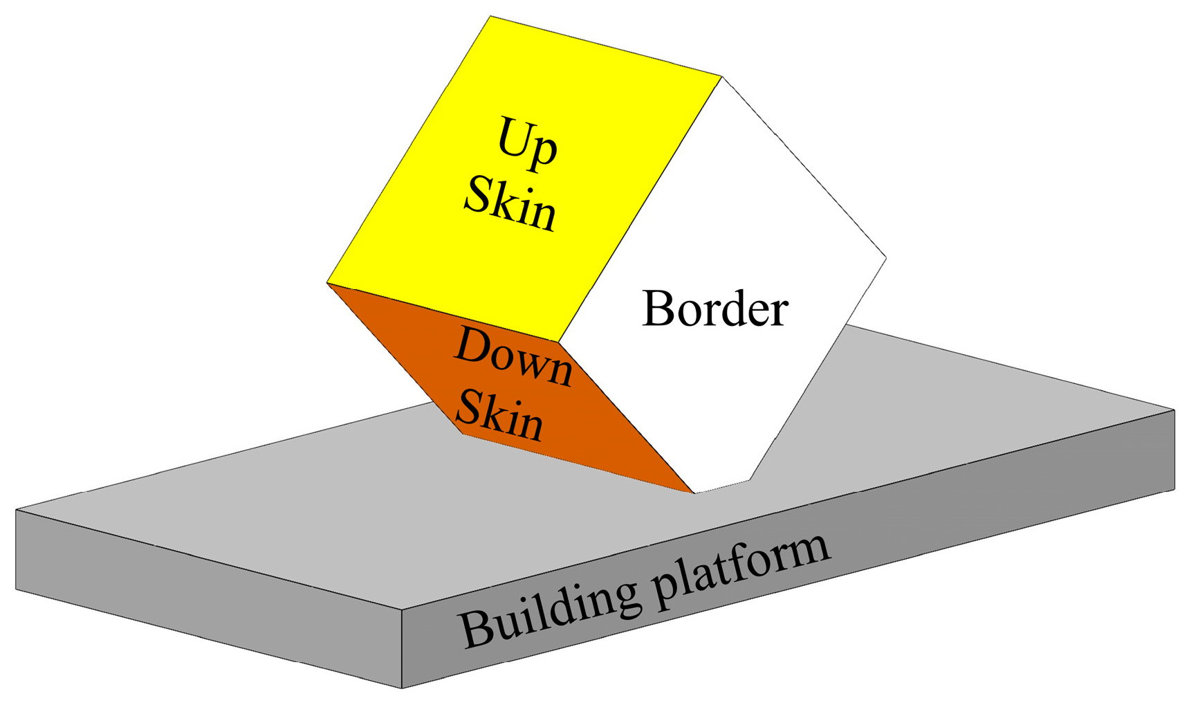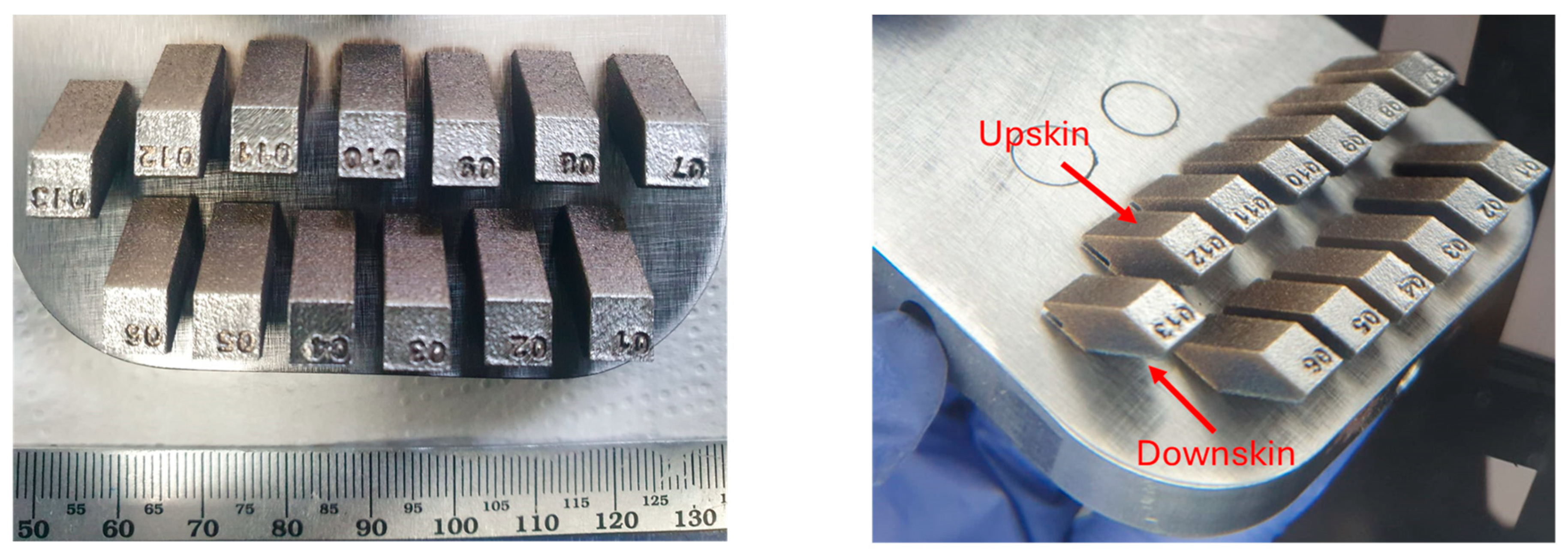 | Upskin Hatch Laser Power (W) | Upskin Hatch Distance (μm) | Upskin Hatch Offset (μm) | Upskin Point Distance (µm) | Upskin Scanning Speed (m/s) | ||