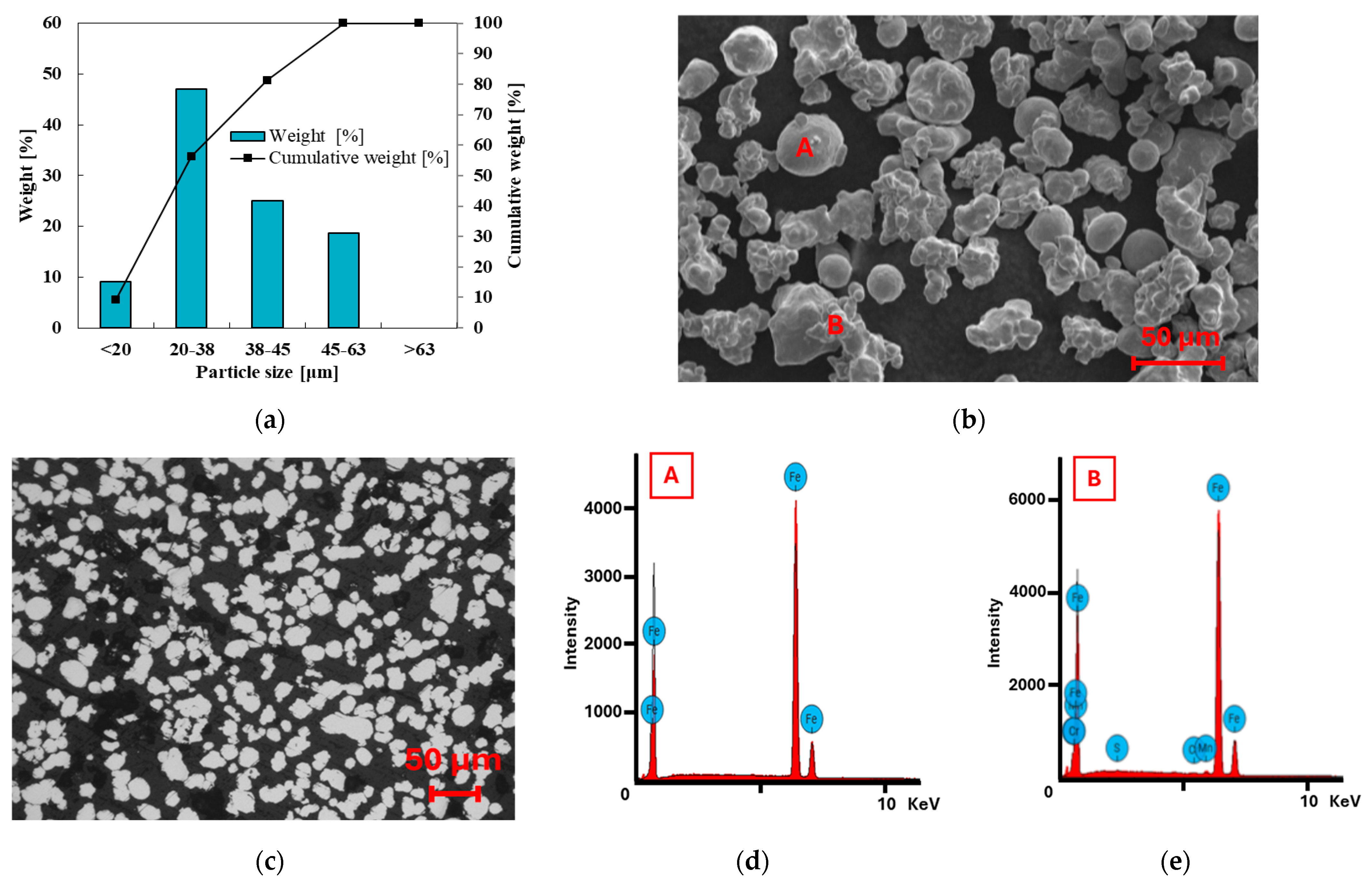 - Im, T.; Gurung, K.; Meyers, S.; Cutolo, A.; Oh, H.; Lee, J.-S.; Van Hooreweder, B.; Lee, C.S. A new strategy for metal additive manufacturing using an economical water-atomized iron powder for laser powder bed fusion. J. Mater. Process. Technol. 2022, 308, 117705. [Google Scholar] [CrossRef]