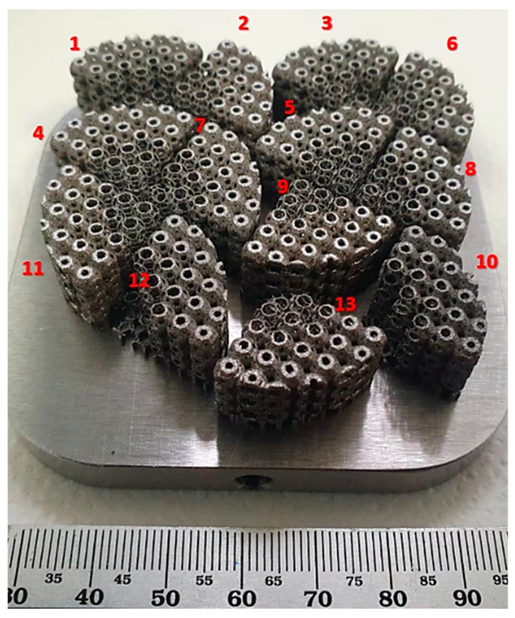 - Nogueira, P.; Magrinho, J.P.G.; Silva, M.B.; Moita de Deus, A.; Vaz, M.F. Compression properties of cellular iron lattice structures used to mimic bone characteristics. Proc. Inst. Mech. Eng. L J. Mater. Des. Appl. 2024, 238, 2217–2232. [Google Scholar] [CrossRef]