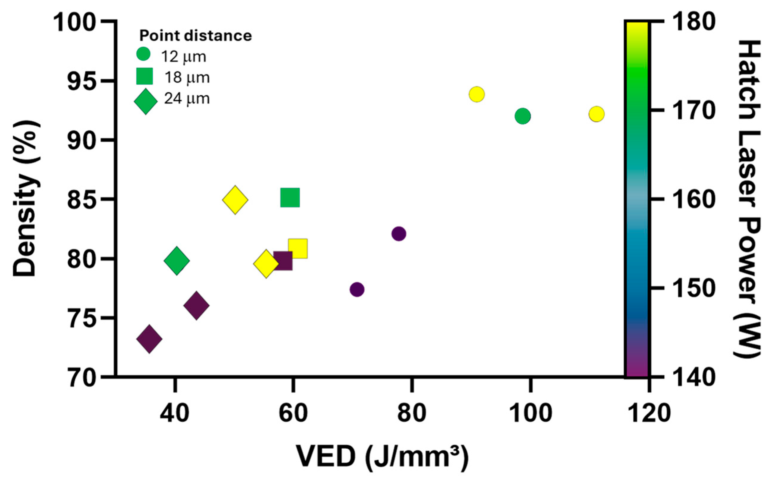 | Hatch Laser Power (W) | Hatch Distance (μm) | Point Distance (µm) | Scanning Speed (m/s) | VED (J/mm3) | ||