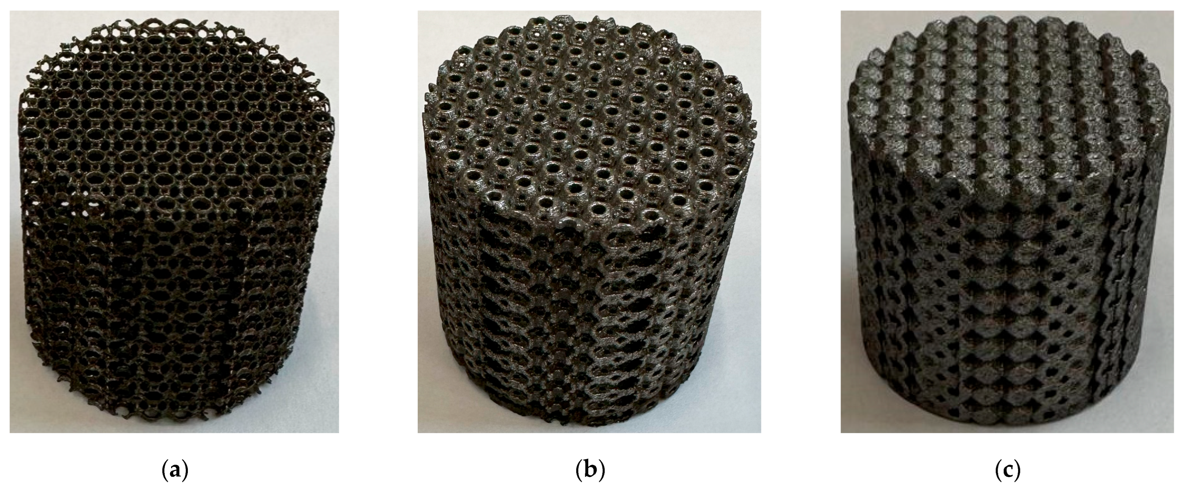 - Nogueira, P.; Lopes, P.; Oliveira, L.; Alves, J.L.; Magrinho, J.P.G.; Deus, A.M.; De Vaz, M.F.; Silva, M.B. Evaluation of Lattice Structures for Medical Implants: A Study on the Mechanical Properties of Various Unit Cell Types. Metals 2024, 14, 780. [Google Scholar] [CrossRef]