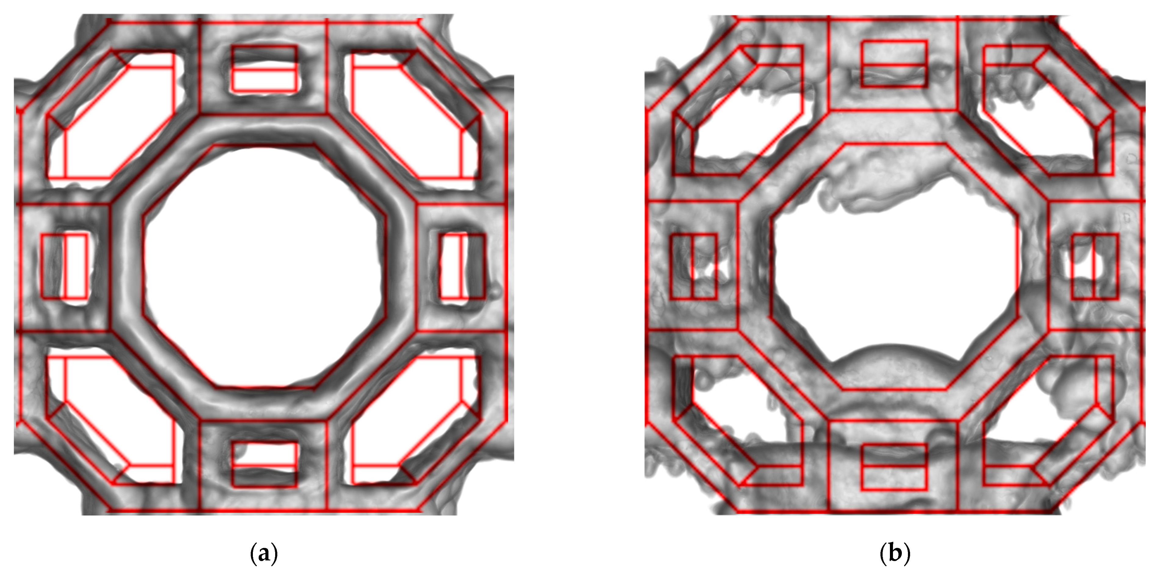 - Zhang, L.; Lifton, J.; Hu, Z.; Hong, R.; Feih, S. Influence of geometric defects on the compression behaviour of thin shell lattices fabricated by micro laser powder bed fusion. Addit. Manuf. 2022, 58, 103038. [Google Scholar] [CrossRef]