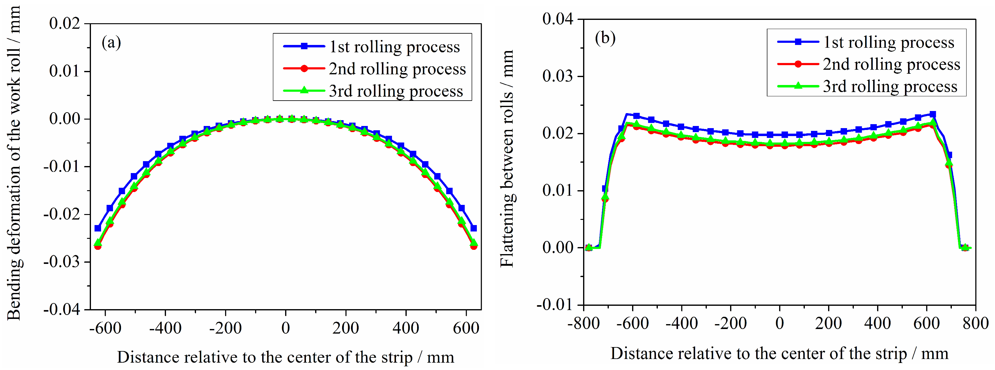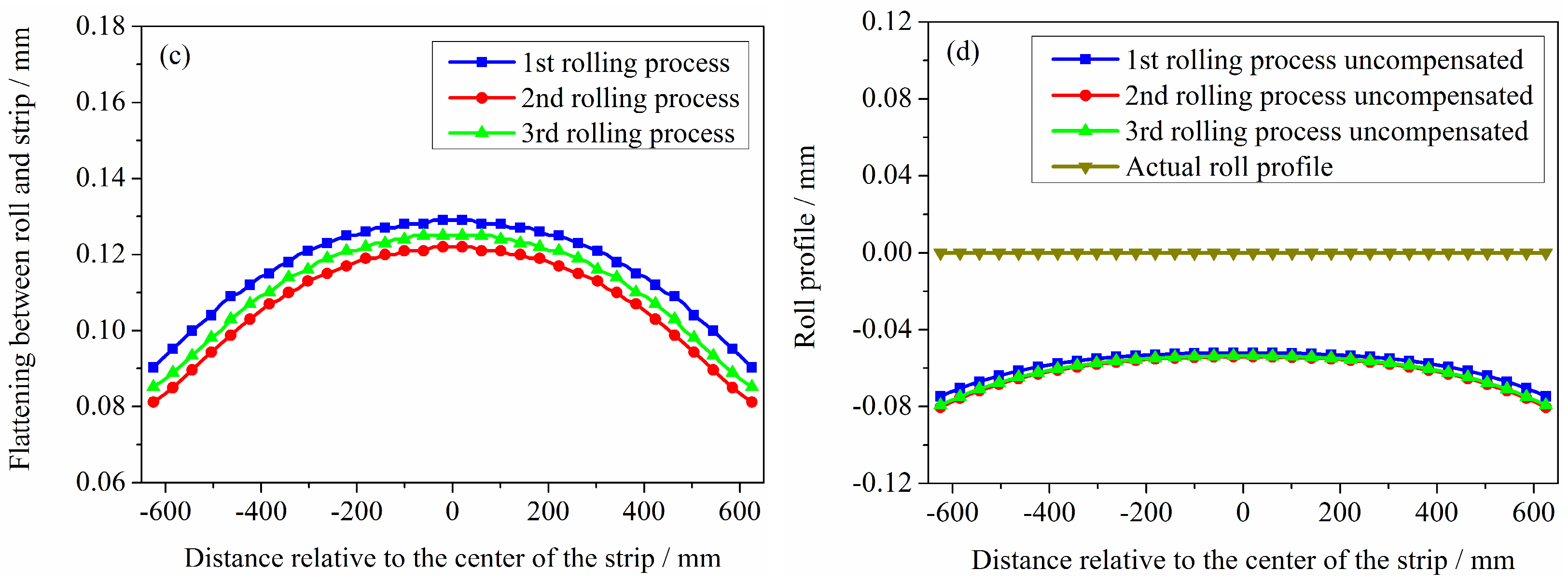 - The pressing process and bending force have a significant impact on the roller system deformation. Roll profile measurement errors are associated with both the deflection deformation and the elastic flattening of the rolls. The roll profile curves without error compensation have a high correlation with the bending deformation of the rolls. The axial displacement of the rolls has a negligible effect on the rolls’ deflection and flattening and consequently exerts minimal influence on roll profile measurement errors. However, when the rolling mill adopts the axial displacement of the roll process, the roll profile measurement system requires displacement compensation in the -axis direction. The magnitude and direction of the compensation should be consistent with the displacement and direction of the corresponding roll.