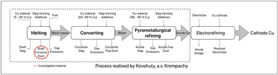 The pyrometallurgical process of copper production, depending on the treatment of primary or secondary raw materials, is carried out in three main stages: smelting, converting, and refining [5,6]. The scheme of secondary copper production is shown in Figure 1. Flue dust is generated in all three processes. They differ in chemical composition, which depends on the mineralogical composition of the concentrates, the melt, and the circulating materials (slag, flue dust, etc.) and their respective ratios [7].