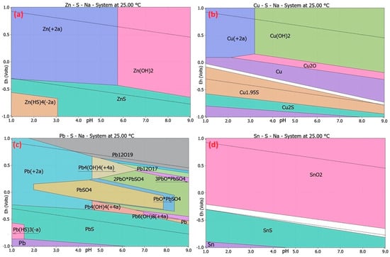 Figure 2 shows the potential–pH diagrams of the Zn–S–Na–H2O, Cu–S–Na–H2O, Pb–S–Na–H2O, and Sn–S–Na–H2O systems at 25 °C, based on all species’ specification and using a 1 to 9 pH scale.