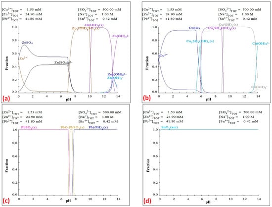 Predicted fraction diagrams of the (a) ZnSO4–NaOH–H2O, (b) CuSO4–NaOH–H2O, (c) PbSO4–NaOH–H2O, and (d) SnO2–NaOH–H2O at 25 °C at the potential Eh = 0.22 V.