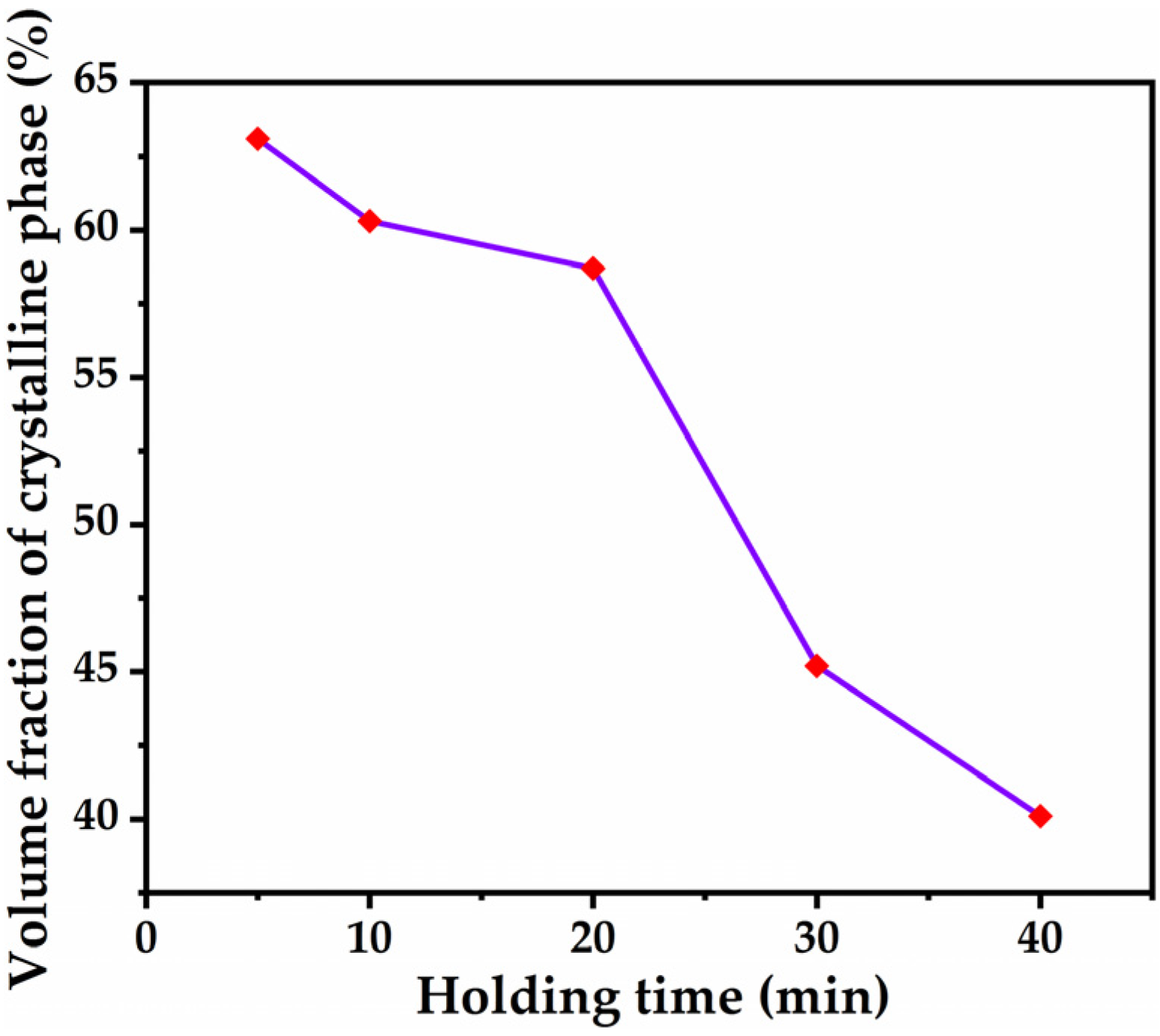 - The β-Ti dendrites of Ti48Zr27Cu6Nb5Be14 amorphous composites evolve into near-spherical/spherical crystals as the holding time increases from 5 to 40 min at 900 °C, with the average crystal size continuously rising to 23.1 μm and the crystal volume fraction gradually dropping.