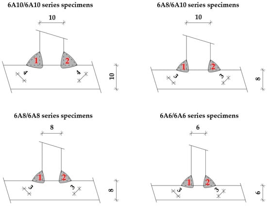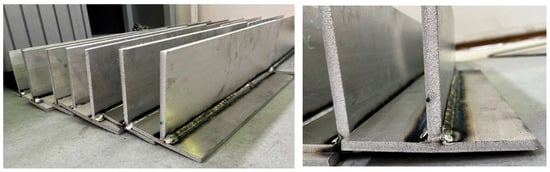 The connection configuration corresponds to a standard T-connection without edge preparation. A double-sided fillet weld was applied along both sides of the vertical plate (web). Each weld pass on one side of the web plate of the T-shaped connection was completed continuously along the entire length before the corresponding weld pass was made on the opposite side. For specimens with plate thicknesses of 6 mm and 8 mm, a 3 mm fillet weld size was used, while for 10 mm plates, the weld size was increased to 4 mm, as shown in Figure 2.