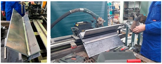 Welding was carried out using two variations of the metal inert gas (MIG 131 according to ISO 4063 [48]) process with pulsed current: DC-MIG-P and AC-MIG-P. The filler metal used was ISO 18273 [49]: S Al 5356/AlMg5Cr with a diameter of 1.2 mm, chosen for its compatibility with the base material and favourable mechanical properties in welded connections. Argon 5.0 (group I1 according to EN ISO 14175 [50]) with a minimum purity of 99.999% was used as shielding gas, with a constant flow rate of 21 L/min. Welding was performed with preheating at 40 °C and an interpass temperature of 60 °C to ensure the same thermal conditions for both processes and eliminate the influence of variable environmental conditions. A dedicated welding fixture was used to ensure repeatability and stability during fabrication, as shown in Figure 3.