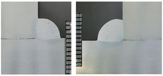 The welded parts of the T-connection were made of the same aluminium alloy Al-Mg-Si with a small amount of Cu, which is a favourable alloy for welding, with a low tendency for hot cracks [32]. Therefore, they were not observed in the analysed macro-sections of the welds. However, it should be noted here that the increased tendency of hot cracks to appear occurs in cases of welding aluminium alloys of different chemical composition or significant differences in the thickness of the welded plates.