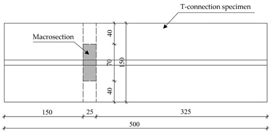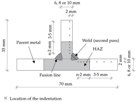 The dimensions of the fillet-welded macrosections and the associated hardness testing plan are shown in Figure 7. The flange length of all fillet-welded macrosections was 70 mm, with a total height of 35 mm. These dimensions were designed to meet the hardness testing requirements specified by EN ISO 9015-1 [66]. One measurement line was defined for hardness testing on each fillet-welded macrosection, located on the side of the specimen where the second weld pass was performed. It was assumed that on this side, the effect of the weld on the base metal hardness reduction would be more pronounced, as the second pass was carried out on material that had been slightly preheated by the first pass. The measurement line was parallel to and positioned 2 mm from the edges of the macrosection.