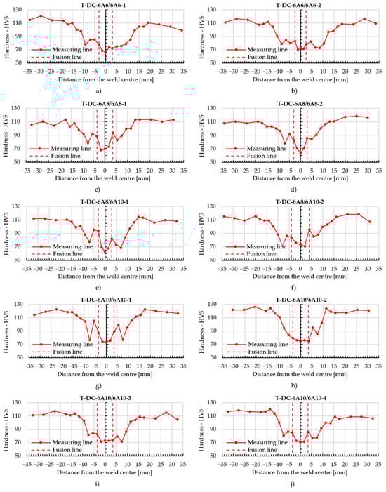 The hardness profiles of the T-connections welded using the DC-MIG-P process exhibit characteristic softening in the HAZ relative to the base material. For specimens welded with plates of equal thickness, specifically 6 mm and 8 mm, the minimum hardness values were observed in the weld zone, typically ranging between 65 HV5 and 75 HV5, compared to average base material hardness values of approximately 110 HV5, which is typical for age-hardened alloy EN AW-6082-T651.