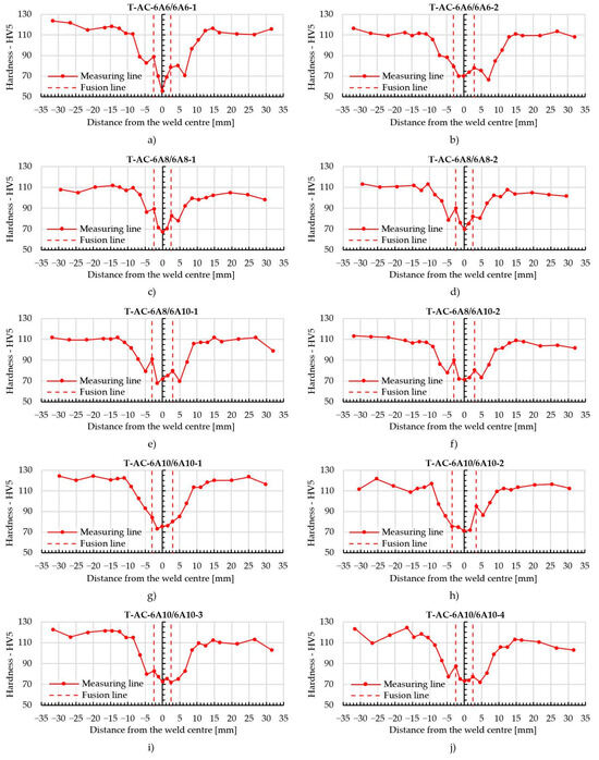 Hardness distribution on macrosections of connections welded using the AC welding process (negative values on diagrams refer to the flange plate, positive values refer to the web plate): (a) T-AC-6A6/6A6-1; (b) T-AC-6A6/6A6-2; (c) T-AC-6A8/6A8-1; (d) T-AC-6A8/6A8-2; (e) T-AC-6A8/6A10-1; (f) T-AC-6A8/6A10-2; (g) T-AC-6A10/6A10-1; (h) T-AC-6A10/6A10-2; (i) T-AC-6A10/6A10-3; (j) T-AC-6A10/6A10-4.