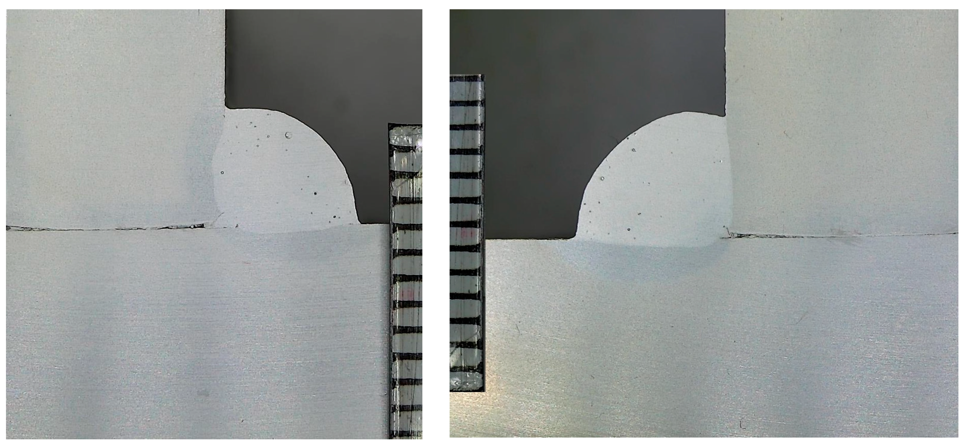 | Weld | ![]() Effective weld thickness: 3.60/3.55 mm Weld penetration: 3.00 mm Percentage of weld penetration: 50.0% Pore density [pores/mm2]: L—0.85; R—0.51 Area fraction [%]: L—0.31; R—0.15 | ![]() Effective weld thickness: 3.30/3.70 mm Weld penetration: 0.80 mm Percentage of weld penetration: 13.0% Pore density [pores/mm2]: L—1.57; R—0.92 Area fraction [%]: L—0.79; R—0.47 |