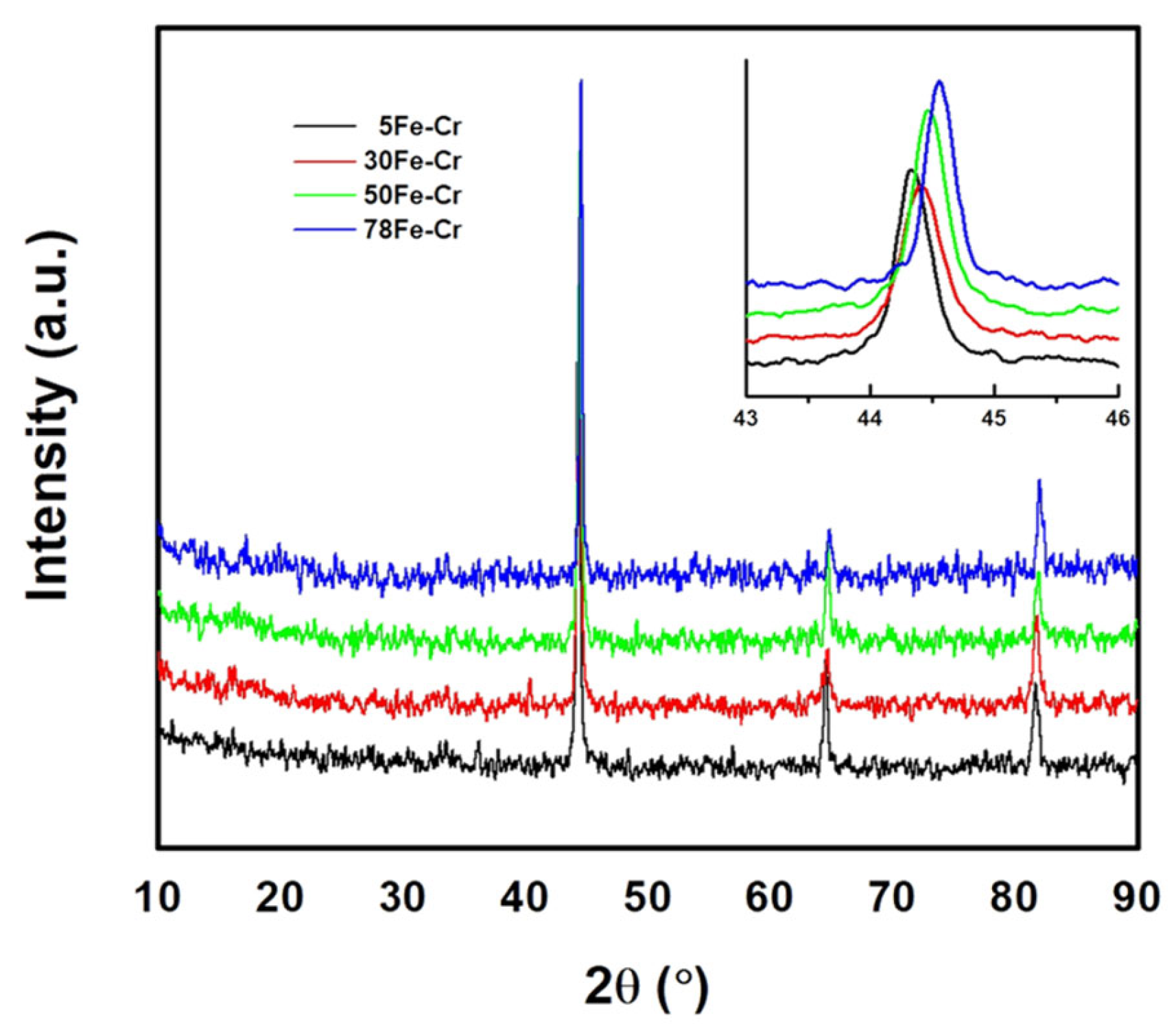 Figure 2 shows the X-ray diffraction patterns of the as-received Fe-Cr powder metallurgy alloys. Both iron (Fe) and chromium (Cr) have a body-centered cubic structure and a very similar lattice constant. The lattice constants are 2.867 Å and 2.885 Å for Fe and Cr, respectively. The three main peaks and corresponding Miller indices (h k l) for the X-ray diffraction patterns of Fe (JCPDS No. 03-065-4899) are at 2θ = 44.66° (1 1 0), 65.01° (2 0 0), and 82.31° (2 1 1). The main peaks and corresponding Miller indices (h k l) for the X-ray diffraction patterns of Cr (JCPDS No. 01-089-4055) are at 2θ = 44.37° (1 1 0), 64.55° (2 0 0), and 81.69° (2 1 1). However, the X-ray diffraction patterns, as shown in Figure 2, are a Fe-Cr crystalline phase (JCPDS No. 00-034-0396). This implies that the Fe-Cr powder metallurgy alloys used in this study had not only a sintered form but also an alloying form. The Fe-Cr crystalline phase is a body-centered cubic structure with a lattice constant of 2.876 Å. Its main peaks and corresponding Miller indices (h k l) are at 2θ = 44.52° (1 1 0), 64.78° (2 0 0), and 82.00° (2 1 1). Moreover, it can be found that the diffraction peak (e.g., 2θ = 44.52°) of the Fe-Cr alloy shifts toward a higher angle with increasing Fe content in the Fe-Cr specimens because the melting temperature of Fe (1538 °C) is lower than that of Cr (1907 °C). Therefore, this phenomenon is ascribed to the higher Fe content and higher degree of alloying of the Fe-Cr powder mixture after sintering at elevated temperatures.