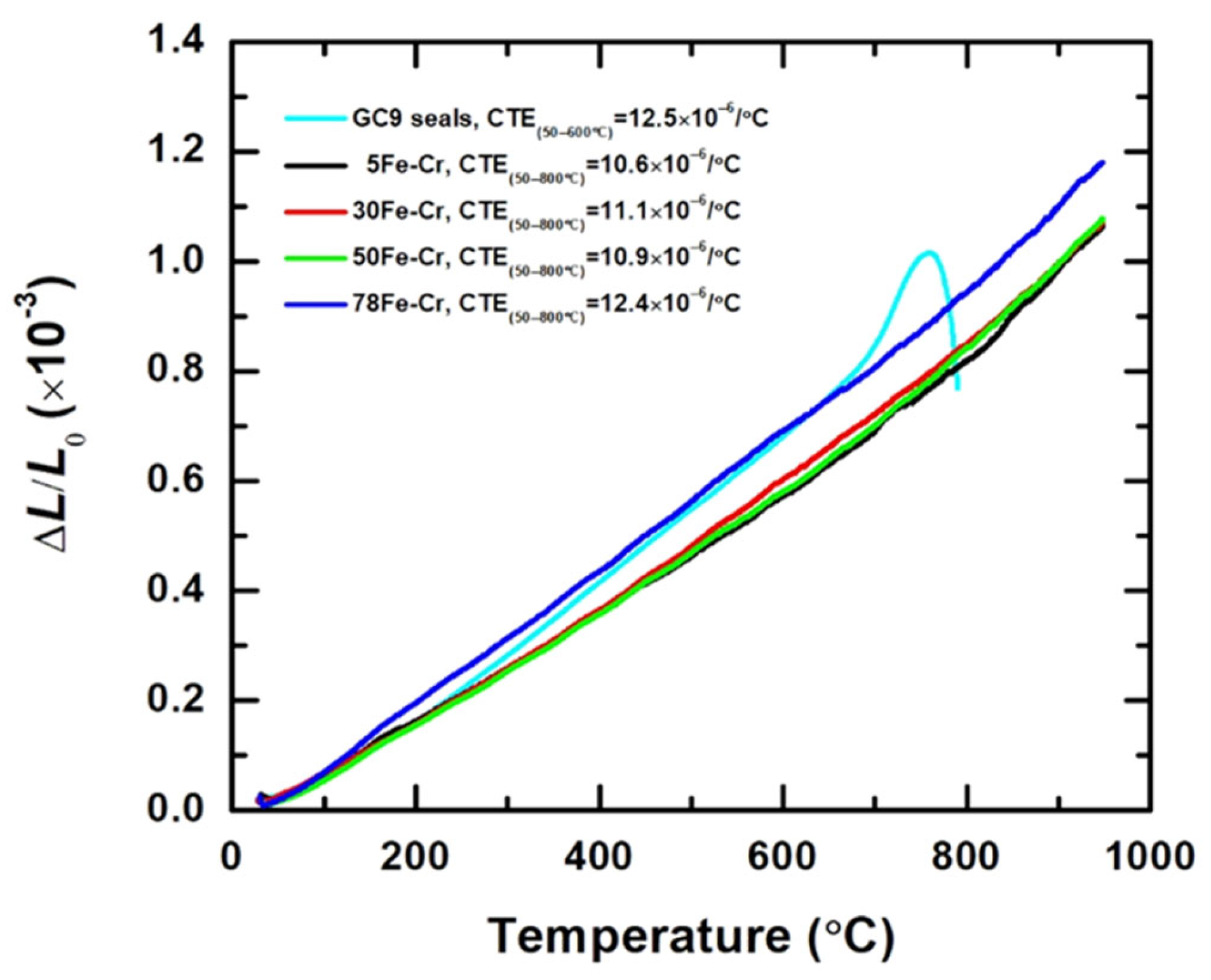 Figure 3 shows the thermal expansion curves corresponding to the GC9 glass and four Fe-Cr alloy specimens. The average coefficient of thermal expansion (CTE) can be calculated from the slope of the thermal expansion curves, and the formula can be written as follows: