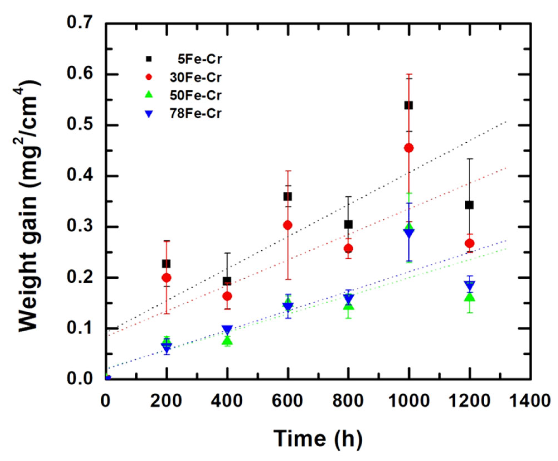The oxidation resistance of the Fe-Cr alloy specimens was determined via the weight gain test. The Fe-Cr coupons were placed into quartz tubes in an electric furnace, heated to 800 °C, and held for 1200 h in air. The specimens were removed from the furnace at a certain point and then cooled and weighed to the fourth decimal place. The weight gain data for each single specimen were obtained by averaging the values from three specimens.