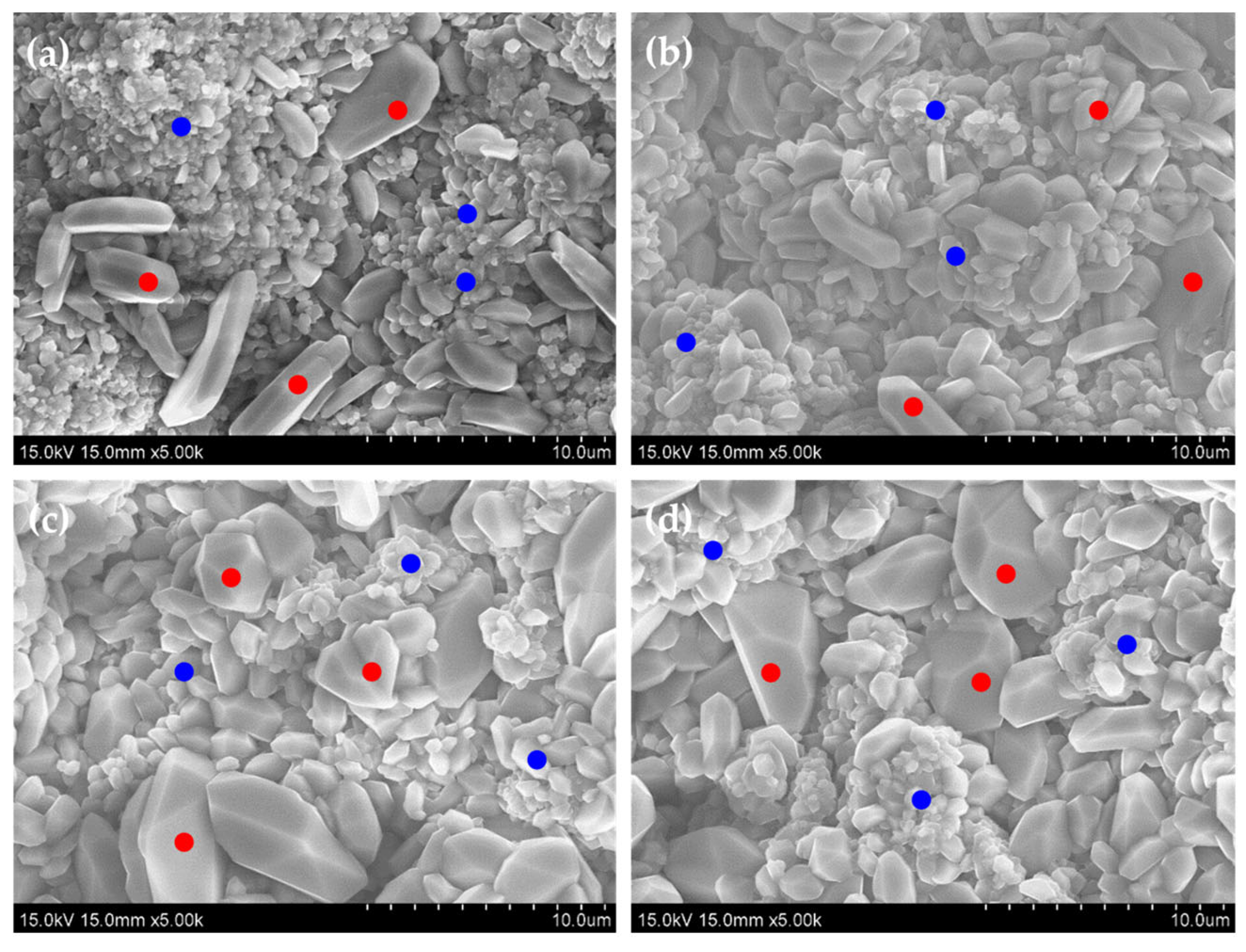All of the specimens for microstructural observation and element analysis were carefully cut, mounted, ground, and polished, and then coated with a thin Pt film introduced to the sample surface. Microstructural examinations were carried out using a scanning electron microscope (SEM) (S-4800I, Hitachi, Tokyo, Japan) equipped with an energy-dispersive X-ray spectrometer (EDS) (EMAX-ENERGY, HORIBA, Kyoto, Japan) to determine the elemental compositions.
