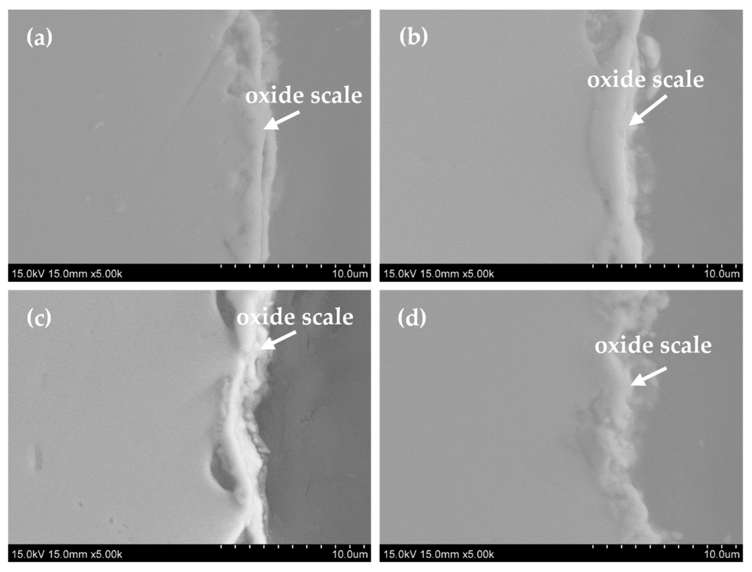 where A is the surface area of the specimen, kp is the parabolic oxidation rate, t is the time, and C is the integration constant. The parabolic law is typically applied to the oxidation of Fe-Cr alloys at elevated temperatures [38,39]. The parabolic oxidation rates of the four Fe-Cr alloy specimens over a test duration of 1200 h are 8.74 × 10−14 g2/cm4·s, 6.97 × 10−14 g2/cm4·s, 4.94 × 10−14 g2/cm4·s, and 5.31 × 10−14 g2/cm4·s for the 5Fe-Cr, 30Fe-Cr, 50Fe-Cr, and 78Fe-Cr alloys, respectively. All specimens used in this study meet the maximum acceptable limit for the parabolic oxidation rate, i.e., 10−13 g2/cm4·s, for their use as metallic interconnects in SOFC stack applications. However, the weight gain data shown in Figure 4, particularly for specimens with high Cr content, exhibit a large standard deviation. This is attributed not only to the growth of the chromia (Cr2O3) scale but also to the evaporation of Cr(VI) on the outer surface of the Fe-Cr alloy specimens at elevated temperatures [41]. M. Tomas et al. [42] evaluated six Cr2O3-forming Fe-Cr steels under a single- and dual-atmosphere, and they reported that although the presence of an oxide scale reduces Cr(VI) evaporation, it is still significant. Moreover, the surface roughness of the specimens also contributed to the variability in the weight gain data. According to Table 2, the surface roughness of high-Cr-content ground Fe-Cr alloy specimens, such as 30Fe-Cr and 50Fe-Cr, is significantly higher than that of 78Fe-Cr. This difference in surface roughness likely affected the weight gain data due to variations in the effective surface area of the specimens used in the weight gain tests. Compared with data reported in the literature [28,38,39,42], the parabolic oxidation rates for ferritic stainless steels range from 10−13 to 10−15 g2/cm4·s within the temperature range of 750 °C to 850 °C. For example, the parabolic oxidation rate of the Fe-Cr22 alloy is 7.81 × 10−13 g2/cm4·s at 850 °C [28]; that of Crofer22APU is 1.6 × 10−14 g2/cm4·s at 800 °C [38]; that of SUS430 is 1.22 × 10−14 g2/cm4·s at 800 °C [38]; and that of AISI441 is 1.1 × 10−14 g2/cm4·s at 750 °C [43]. Figure 5a–d shows the surface morphologies of the four Fe-Cr alloy specimens after aging at 800 °C for 1200 h in air. Moreover, it can be seen that there is no blistering or spallation on the oxide scale for all specimens after long-term oxidation. Figure 6a–d present the microstructures of the oxide scale of the four Fe-Cr alloy specimens aged at 800 °C for 1000 h in air. Some of the well-developed crystalline grain growth in the oxide scale matrix can be seen. However, most of the compositions of the oxide scale are chromia, i.e., Cr2O3 [42,44,45,46,47]. The average elemental compositions of the oxide scale, as shown in Figure 6a–d, are listed in Table 4. Note that the compositions of Fe listed in Table 4 are negligible because the data are scattered, and the trace amount of Fe detected might be from the iron substrate. In addition, the cross-sectional microstructure of the four Fe-Cr alloy specimens aged at 800 °C for 1000 h in air is shown in Figure 7a–d. Again, no blistering or spallation can be found at the interface between the alloy matrix and the oxide scale.