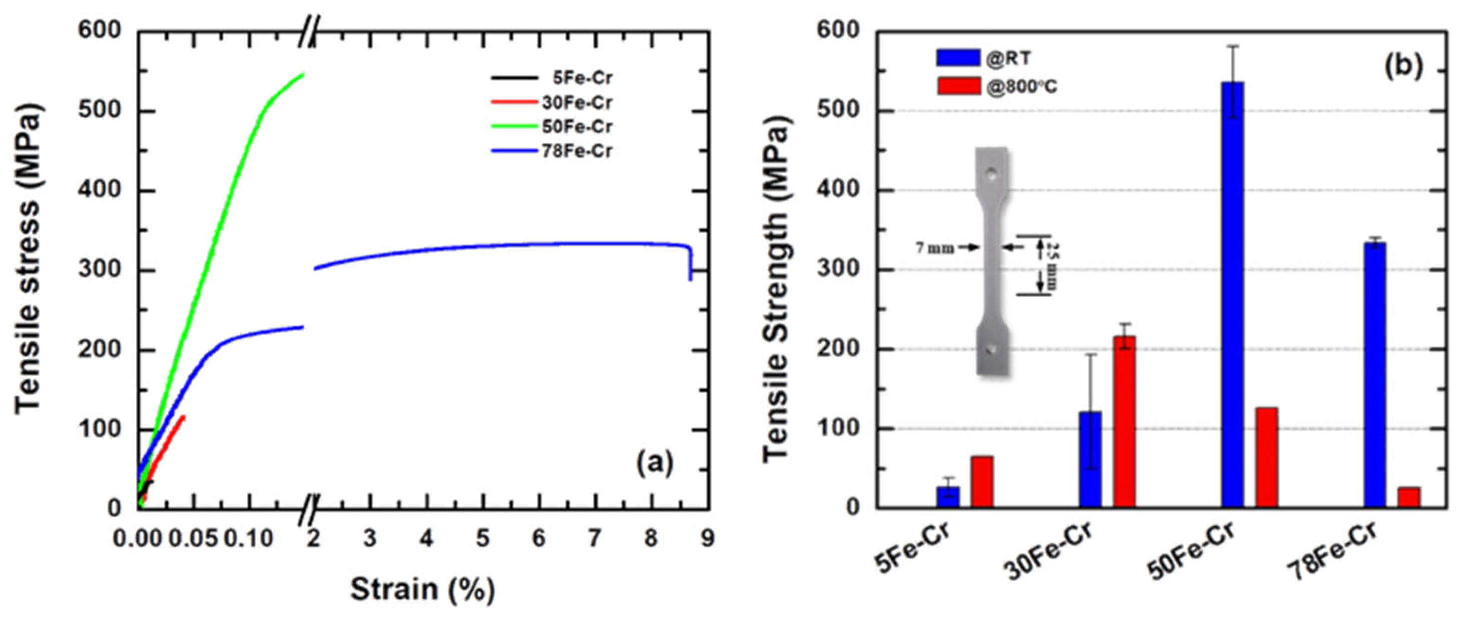 (a) The typical tensile curves and (b) the tensile strength for the four Fe-Cr alloy specimens with different Fe/Cr ratios.