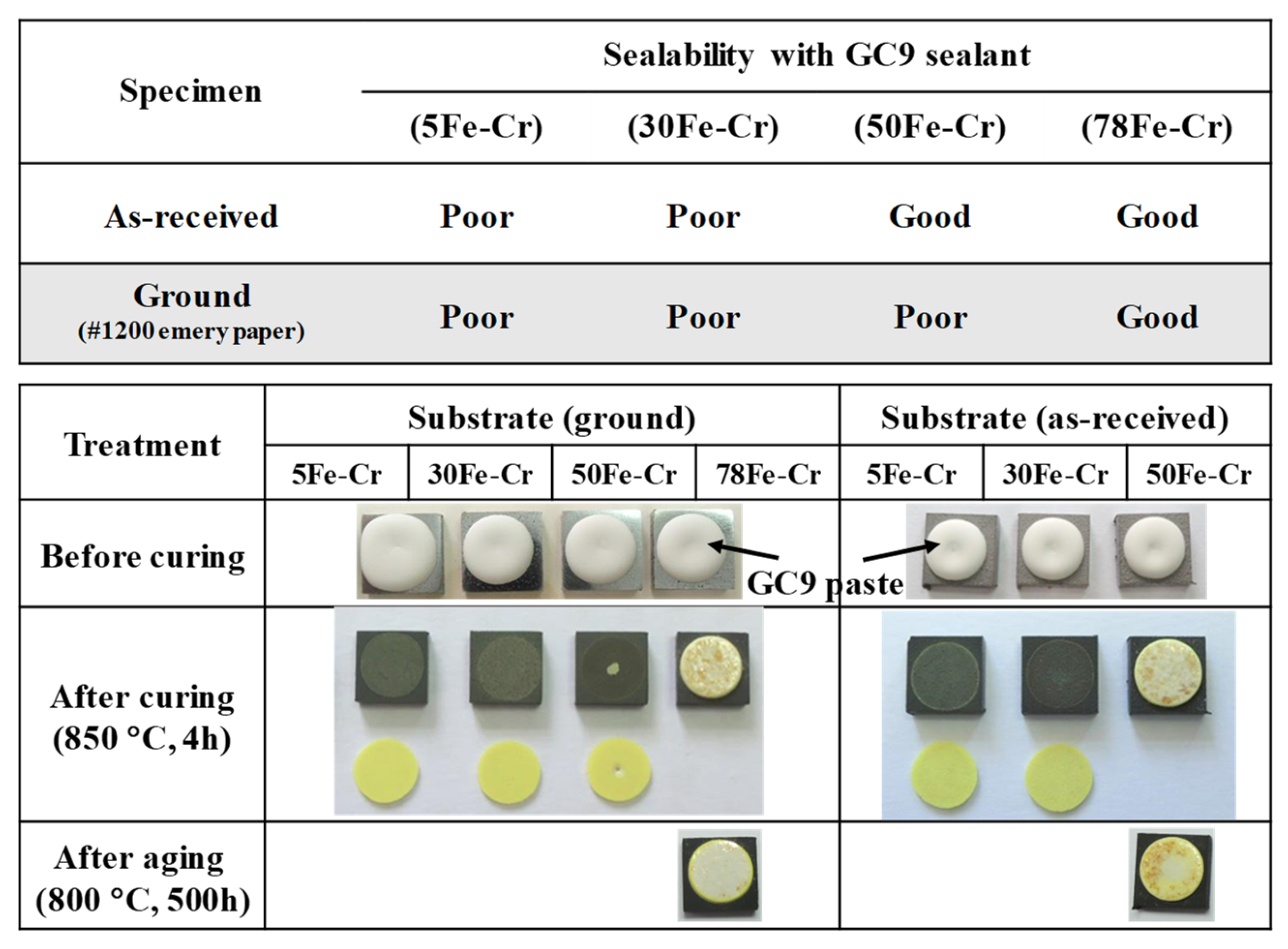 Adhesion test results of the four Fe-Cr alloy specimens with GC9 seals.