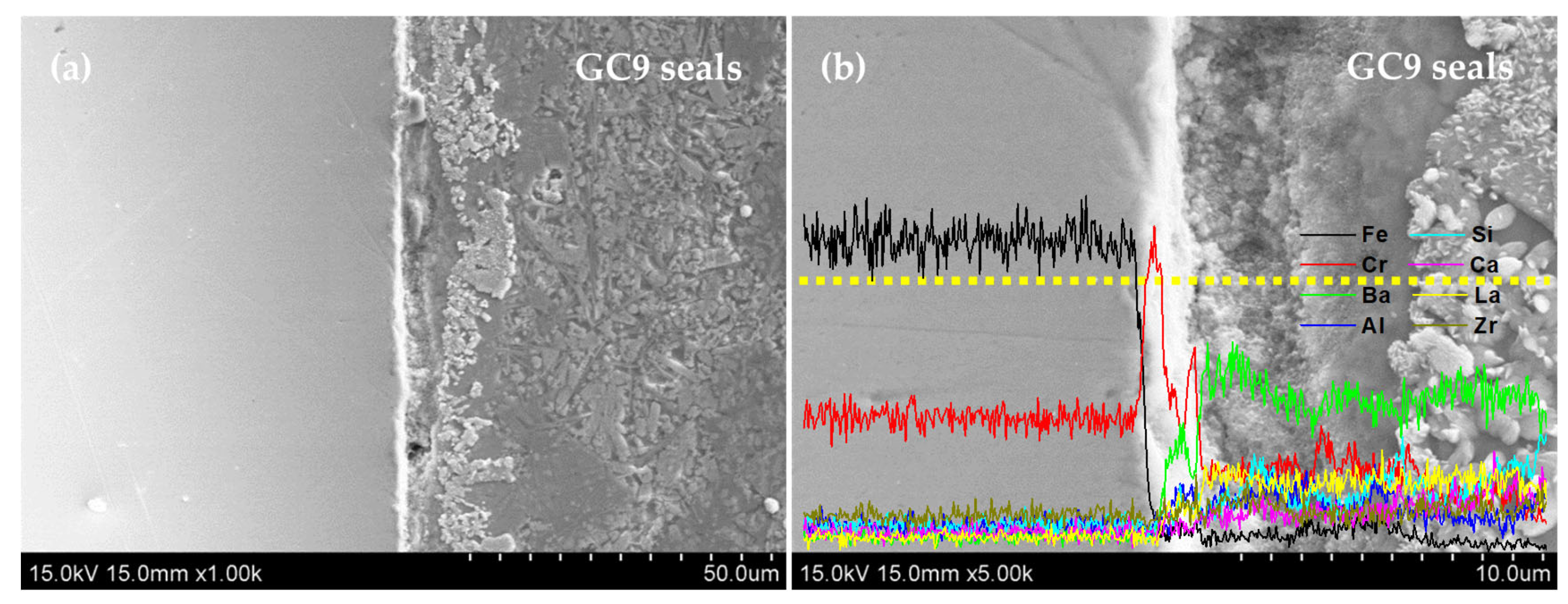 Metallic interconnects used in SOFC stacks must achieve a good seal with the adjacent components via high-temperature sealants to maintain high-temperature gas-tightness. In the present study, we use GC9 glass as a high-temperature sealant adhered to the four Fe-Cr alloy specimens to examine the interfacial compatibility and chemical stability between the GC9 glass and the Fe-Cr coupons. The results of the adhesion test of the four Fe-Cr alloy specimens with GC9 glass paste after curing at 850 °C for 4 h are shown in Figure 9. The 78Fe-Cr specimen demonstrates good adhesion compatibility to the GC9 seals, as well as after aging at 800 °C for 500 h in air, irrespective of whether it is as-received or a ground sample. Figure 10 shows the cross-sectional microstructure and elemental profile of the 78Fe-Cr specimen adhered to the GC9 seal before and after aging at 800 °C for 500 h. It was found that the interface remained rigidly contacted, and there was no crack or spallation formation after 500 h of heat treatment. Additionally, no obvious diffusion of elements occurred in the adhesion interface region between the GC9 glass and the 78Fe-Cr specimen. Again, this indicates that the GC9 glass/78Fe-Cr joint is suitable for SOFC stack applications.