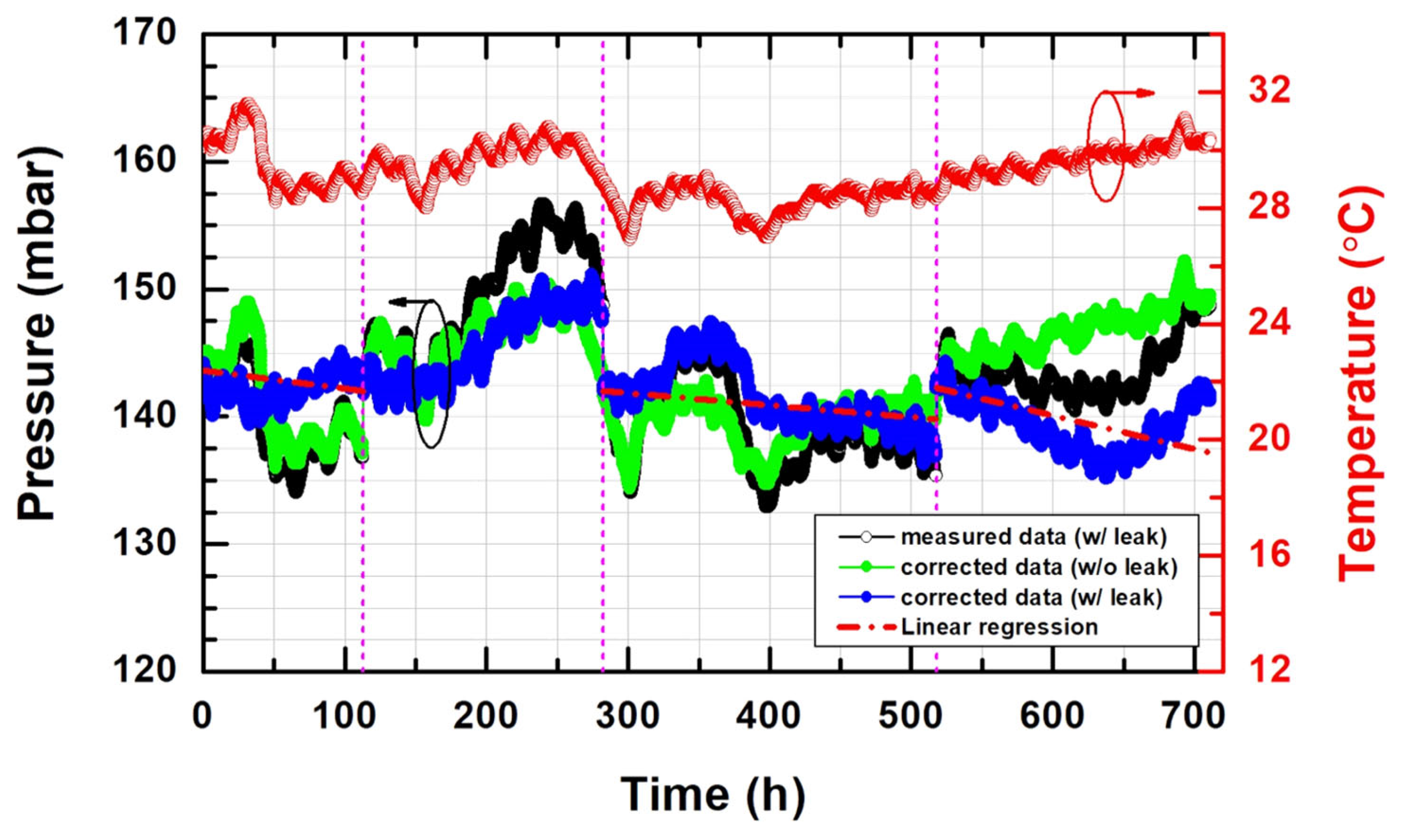 It is important that the 78Fe-Cr/glass/78Fe-Cr joint provides gas-tightness during sealing and operating processes for use as an interconnect in an SOFC stack at elevated temperatures. Pressure testing is a very common method of validating the sealability of a container or pipe. In this study, high-temperature leak rate measurements of the 78Fe-Cr/glass/78Fe-Cr joint were performed under the condition of aging at 800 °C for 700 h in air. The evolution of the pressure changes with elapsing time for the sealed 78Fe-Cr/glass/78Fe-Cr joint at 800 °C for 700 h in air is shown in Figure 11. The leak rate (L.R.) can be calculated from the leak test data as follows: