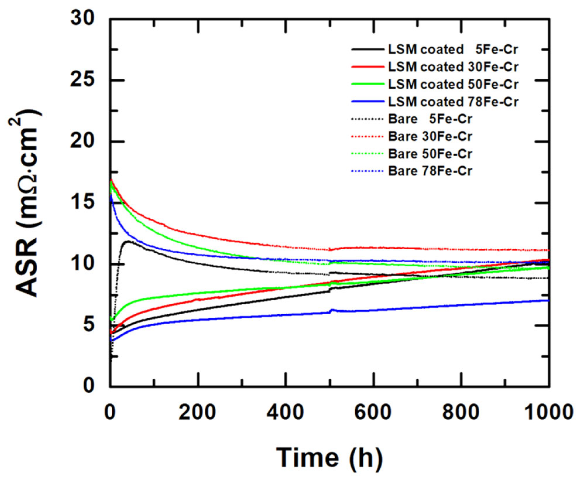 - The results of the high-temperature area-specific surface resistance measurement showed that the ASR value of the LSM-coated 78Fe-Cr alloy specimen is 7.04 mΩ·cm2 after aging at 800 °C for 1000 h in air, and the linear increase rate is 1.96 × 10−3 mΩ·cm2/h, and it therefore meets the application requirements for a metallic interconnect used in SOFC stacks.