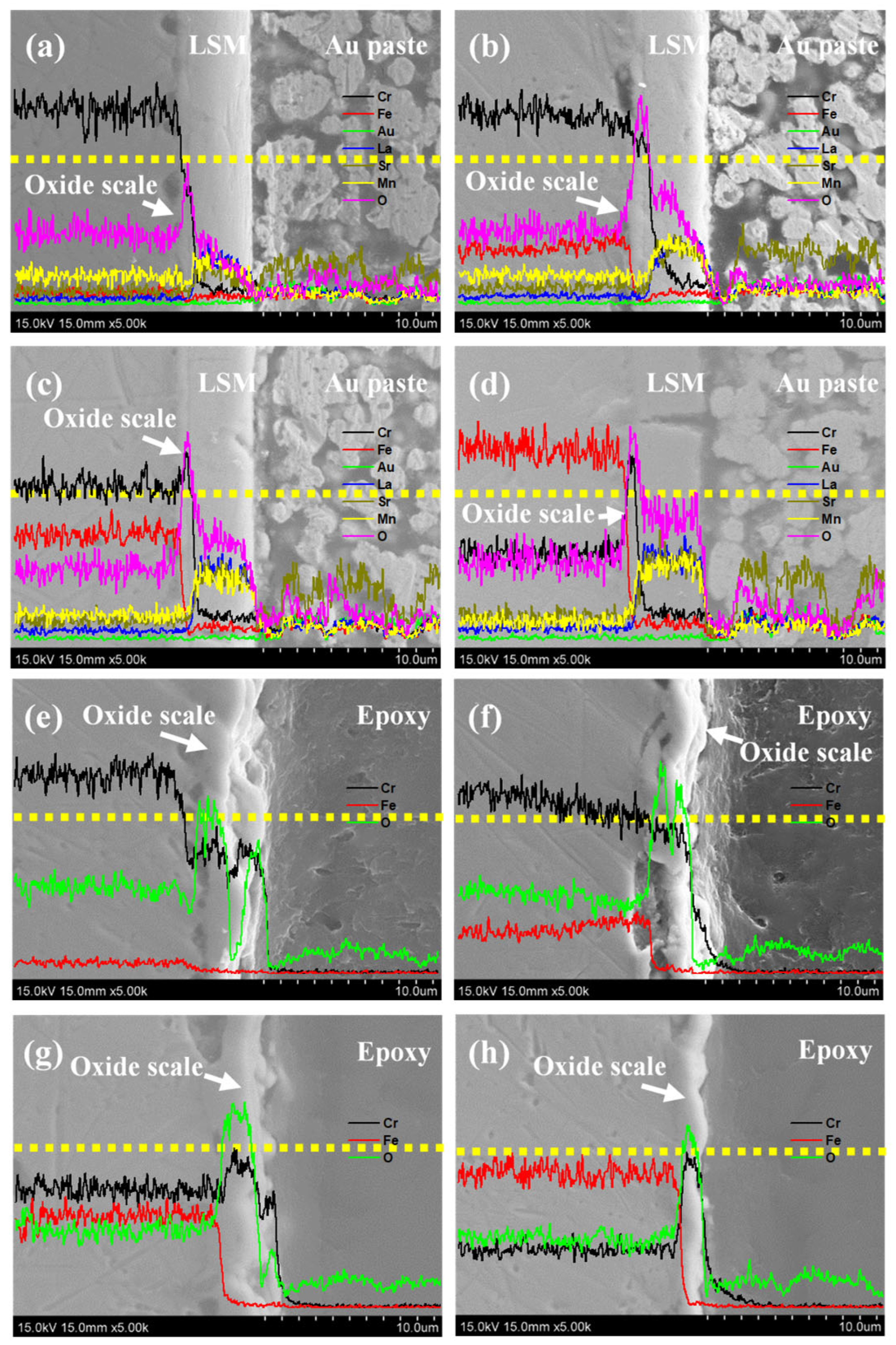 Cross-section micrographs and elemental concentration profiles of the LSM-coated specimens ((a) 5Fe-Cr, (b) 30Fe-Cr, (c) 50Fe-Cr, and (d) 78Fe-Cr) and bare specimens ((e) 5Fe-Cr, (f) 30Fe-Cr, (g) 50Fe-Cr, and (h) 78Fe-Cr) at 800 °C for 1000 h in air (dotted line: EDS line scan).