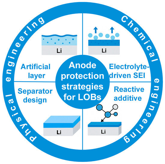 Summary of anode protection strategies for LOBs, highlighting physical (artificial layer and separator design) and chemical (electrolyte-driven SEI and reactive additives) engineering to enhance lithium anode stability.