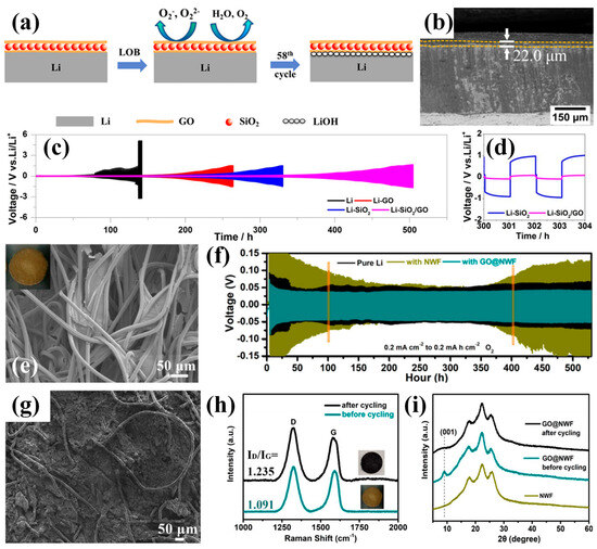 In addition to inorganic–carbon hybrid APLs, a different approach emphasizing mechanical flexibility and conductive network formation has also been demonstrated. In a separate study, Guo et al. developed a flexible graphene oxide-modified nonwoven fabric (GO@NWF, Figure 3e) that served as a freestanding APL for LOBs [48]. The GO@NWF APL was inserted between the LMA and the separator, serving as an interfacial barrier that stabilized Li plating and stripping under O2 atmosphere. Symmetric Li|Li cells equipped with this membrane exhibited flatter voltage profiles and smaller hysteresis than those using bare Li or pristine NWF (Figure 3f). The GO@NWF-protected cell maintained a stable voltage hysteresis below 45 mV without short-circuiting for over 550 h, confirming its ability to enhance Li+ transport kinetics and suppress interfacial degradation in oxygen-rich conditions. Post-cycling SEM observations revealed that the GO@NWF-covered Li surface remained relatively smooth and compact with coralloid Li deposition (Figure 3g), confirming that the membrane effectively guided uniform Li growth and mitigated surface roughening during repeated cycling. The remarkable LMA stabilization achieved by the GO@NWF APL was attributed to an in situ reduction process of GO during the initial cycling, which transformed the insulating GO@NWF into a conductive rGO@NWF network through an electrochemical reaction between GO and Li (GO + 2H+ + 2e− → rGO + H2O, the electron exchange reaction between GO and Li) [49,50]. This transformation was verified by an increased ID/IG ratio in the Raman spectra (Figure 3h) and the disappearance of the (001) diffraction peak of GO in XRD patterns (Figure 3i), confirming the formation of rGO during the first Li plating/stripping cycle. The resulting thin rGO layer uniformly coated on the NWF fibers enhanced the electronic conductivity of the membrane and promoted even Li+ flux distribution at the anode interface, thereby suppressing dendrite growth, improving interfacial stability, and ultimately leading to markedly enhanced cycling performance of Li–O2 cells.