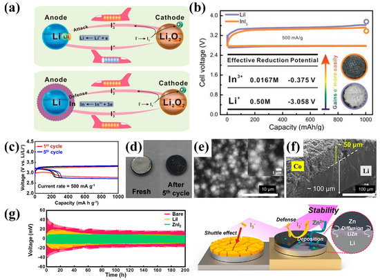 (a) Schematic illustration of the iodide shuttle effect during charge (top) and the formation of a protective indium layer using InI3 as a self-defense redox mediator (bottom). (b) Galvanostatic discharge–charge curves of LOB cells containing LiI or InI3 (Reproduced with permission from Ref. [45], copyright 2015, Royal Society of Chemistry). (c) Voltage profiles comparing 1st and 5th cycles of CoI2−SDRM cells. (d) Photographs of Li anode before and after cycling with CoI2. (e) SEM image of Co nanoparticle layer on Li surface. (f) Cross-sectional SEM showing ~100 μm Co−based protective layer (Reproduced with permission from Ref. [88], copyright 2022, Elsevier). (g) Long−term cycling stability of symmetric cells (bare, LiI, ZnI2), and schematic of ZnI2−induced LiZn/Zn protective layer formation and I3− suppression. (Reproduced from Ref. [89]).