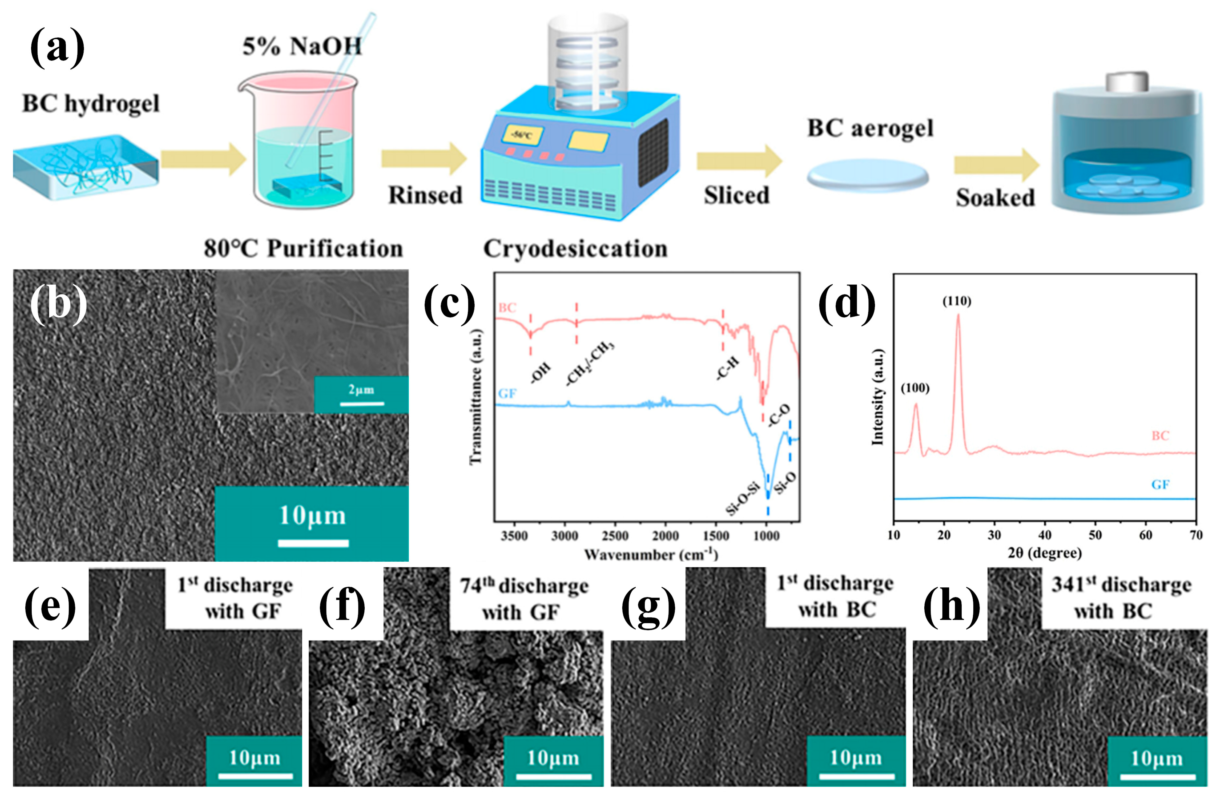 - Wu, A.; Wang, M.; Pang, Y.; Li, X.; Zhuge, X.; Luo, Z.; Ren, G.; Luo, K.; Ren, Y.; Liu, D.; et al. Single-Ion Conductive Bacterial Cellulose Membrane Towards High Performance Lithium-Oxygen Batteries. Battery Energy 2025, 4, e70027. [Google Scholar] [CrossRef]
