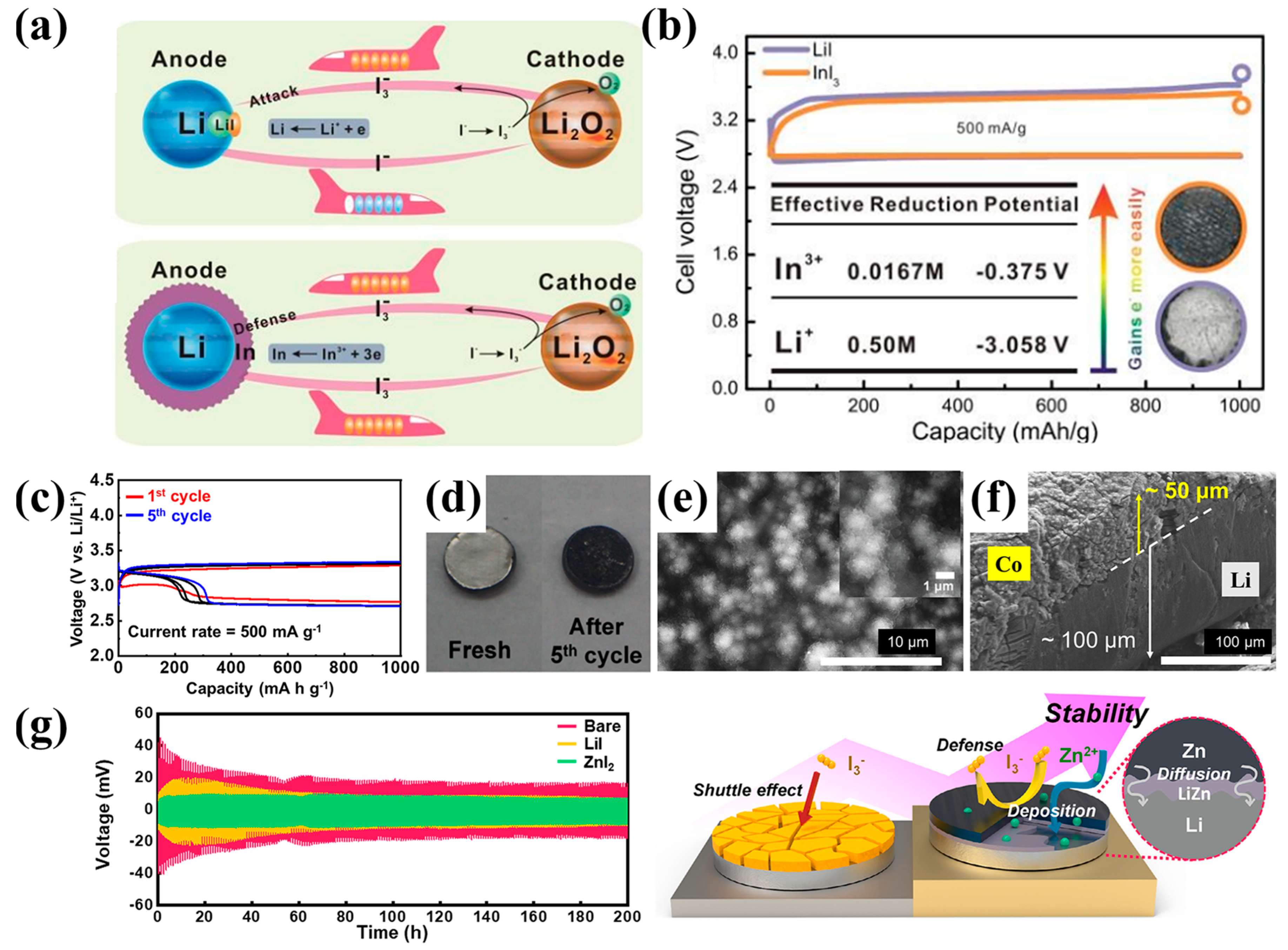 - Hwang, B.; Sung, M.C.; Jung, S.; Kim, M.S.; Kim, D.W. Boosting Li–O2 Battery Performance and Stability With ZnI2: Synergistic Effects on Anode Protection and Cathode Activation. SusMat 2025, 5, e70020. [Google Scholar] [CrossRef]