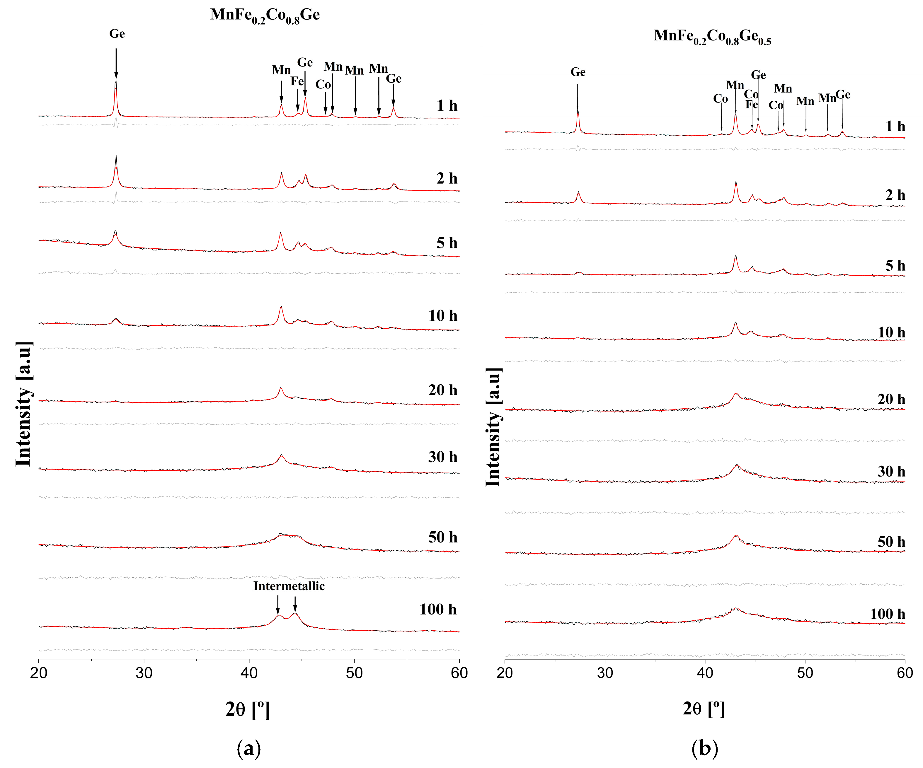 - Vidal-Crespo, A.; Ipus, J.J.; Blázquez, J.S.; Conde, A. Mechanical Amorphization and Recrystallization of Mn-Co(Fe)-Ge Compositions. Metals 2019, 9, 534. [Google Scholar] [CrossRef]