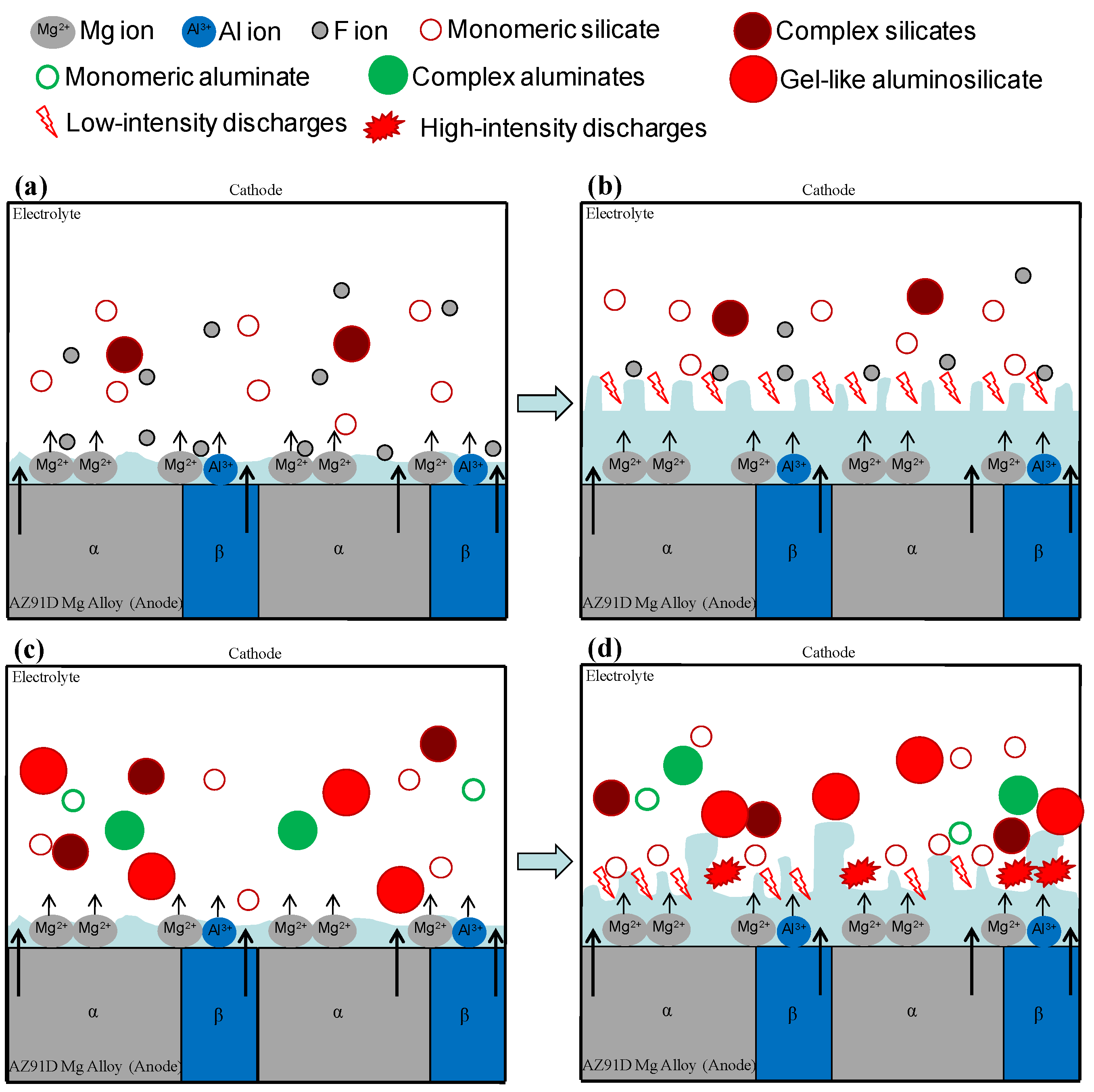 - Chen, Y.; Yang, Y.; Zhang, T.; Zhang, W.; Wang, F.; Lu, X.; Blawert, C.; Zheludkevich, M.L. Interaction effect between different constituents in silicate-containing electrolyte on PEO coatings on Mg alloy. Surf. Coat. Technol. 2016, 307, 825–836. [Google Scholar] [CrossRef]
