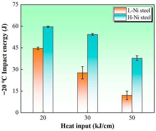 Figure 1 first presents the impact toughness characteristics of the simulated CGHAZ of experimental steels with different Ni contents at −20 °C. It can be observed that the impact energy of both steels gradually decreases with increasing heat input, but the H-Ni steel consistently maintains superior toughness performance with a relatively weaker downward trend in impact energy. The decreasing trend of impact energy with increasing heat input is associated with the reduced Δt8/5 cooling rate caused by higher heat input [17,19,20]. Specifically, a slower cooling rate promotes the formation of coarser intermediate-temperature transformation products, which are known to impair low-temperature toughness. Conversely, excessively low heat input can also increase the tendency for martensite formation, similarly deteriorating low-temperature impact toughness [17,21]. However, the increase in Ni content is found to significantly enhance the low-temperature impact toughness of the CGHAZ. Even under relatively high heat input conditions, the CGHAZ can still achieve relatively high impact toughness. This should be related to Ni promoting the low-temperature bainite transformation. Increased Ni content can inhibit the formation of brittle microstructures such as M/A constituents, facilitating a more complete low-temperature bainite transformation [12]. This refines the transformed microstructure and improves crack propagation resistance.