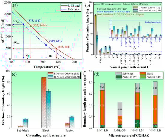 To further clarify why the refinement effect of crystallographic structure units in the LM structure of the H-Ni steel is more significant, microscopic structure digitization and quantitative calculation methods [16,17] were used to compare and present the quantitative results of the CGHAZ microstructures of the H-Ni steel and L-Ni steel under the heat input of 20 kJ/cm, as shown in Figure 6b,c. Under the heat input of 20 kJ/cm, the L-Ni steel is more prone to promoting the formation of V1/V2 variant pairs (block boundary); in contrast, the H-Ni steel tends to form other variant pairs, namely V1/V5 and V1/V6 (block boundaries), V1/V4 (sub-block boundary), and V1/V7-V24 (packet boundaries). This indicates that the LM structure in the H-Ni steel has a weaker tendency for variant selection. Figure 6c further presents the statistical results of the proportion of three typical crystallographic structure boundaries in the two microstructures. It can be seen that the LB structure obtained in the L-Ni steel is dominated by block boundaries, while the LM structure obtained in the H-Ni steel has significantly higher proportions of packet and sub-block boundaries than the L-Ni steel. Furthermore, Figure 6d shows the statistical results of the density of various boundaries per unit area for the four CGHAZ microstructures. It is observed that the GB structure has the lowest block boundary density due to its coarser crystallographic structure; the LB structure has the highest density of block boundaries; and the LM structure possesses a higher density of packet boundaries.