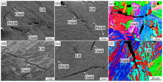 Relationship of secondary crack propagation path and crystallographic structure obtained from the impact fracture sample of CGHAZ with heat input of (a,d) 20 and (b,c,e,f) 50 kJ/cm: (a–c) L-Ni steel and (d–f) H-Ni steel.