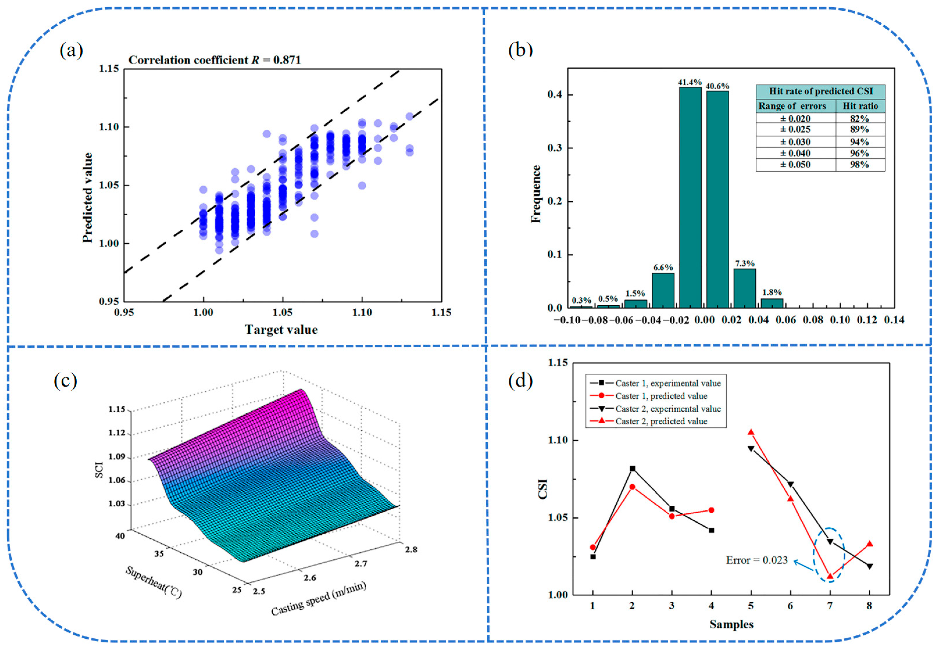 | Zou et al. | R-ELM | Segregation detection | The prediction hit rate within the error range of ±0.03 reaches 94%, adapting to multi-steel grade detection | [71] |