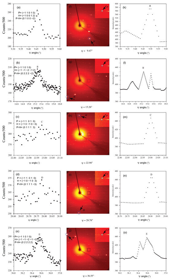Significant multiple diffraction peaks of primary reflection (−1 1 0 1 0) during a 40° of -scans. From the measurements, these peaks are located at (a) 9.47° (peak A), (b) 15.26° (peak B), (c) 22.98° (peak C), (d) 28.78° (peak D), and (e) 36.55° (peak E); from the simulation by the simple approach introduced in the text, they are located at (k) 9.495° (peak A), (l) 15.26° (peak B), (m) 23.00° (peak C), (n) 28.905° (peak D), and (o) 36.58° (peak E). Figure (f–j) demonstrates the appearance of corresponding main and operating reflections on the diffraction frames. The marked zones that contain the main reflection are shown enlarged in the insert figures.